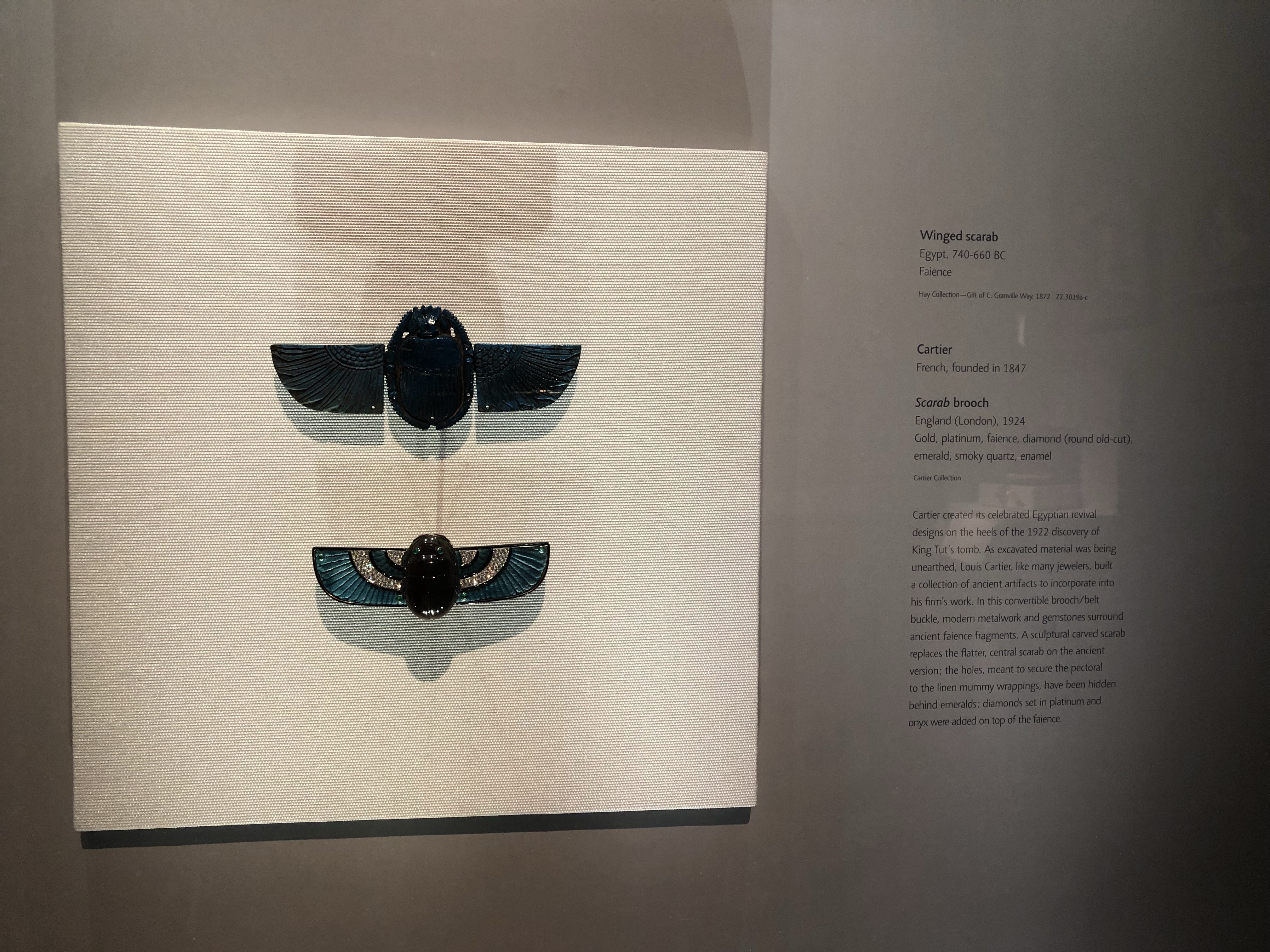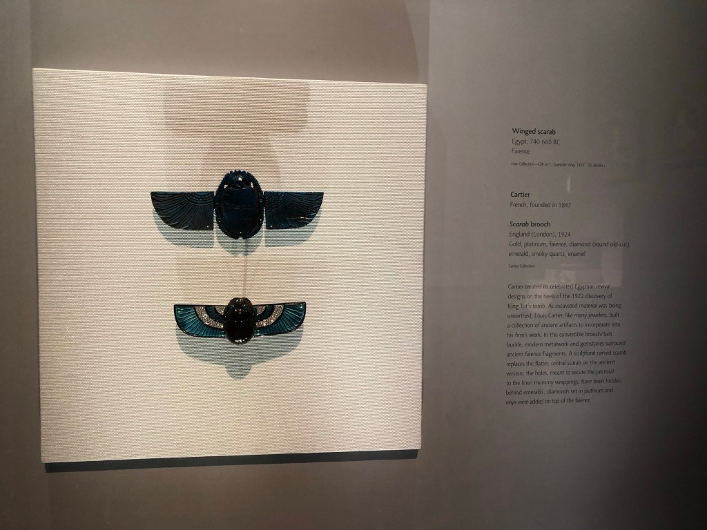 Juxtaposing the past with the present is something that I very much appreciate. Actually seeing inspiration from the past that has influenced something in the present can have great impact. On entering the exhibition space, the first object you see is a winged scarab from 740-660 BC lying above a 1924 Cartier scarab brooch. Full disclosure, the exhibition is sponsored by Cartier so no surprise that one of their pieces featured.
