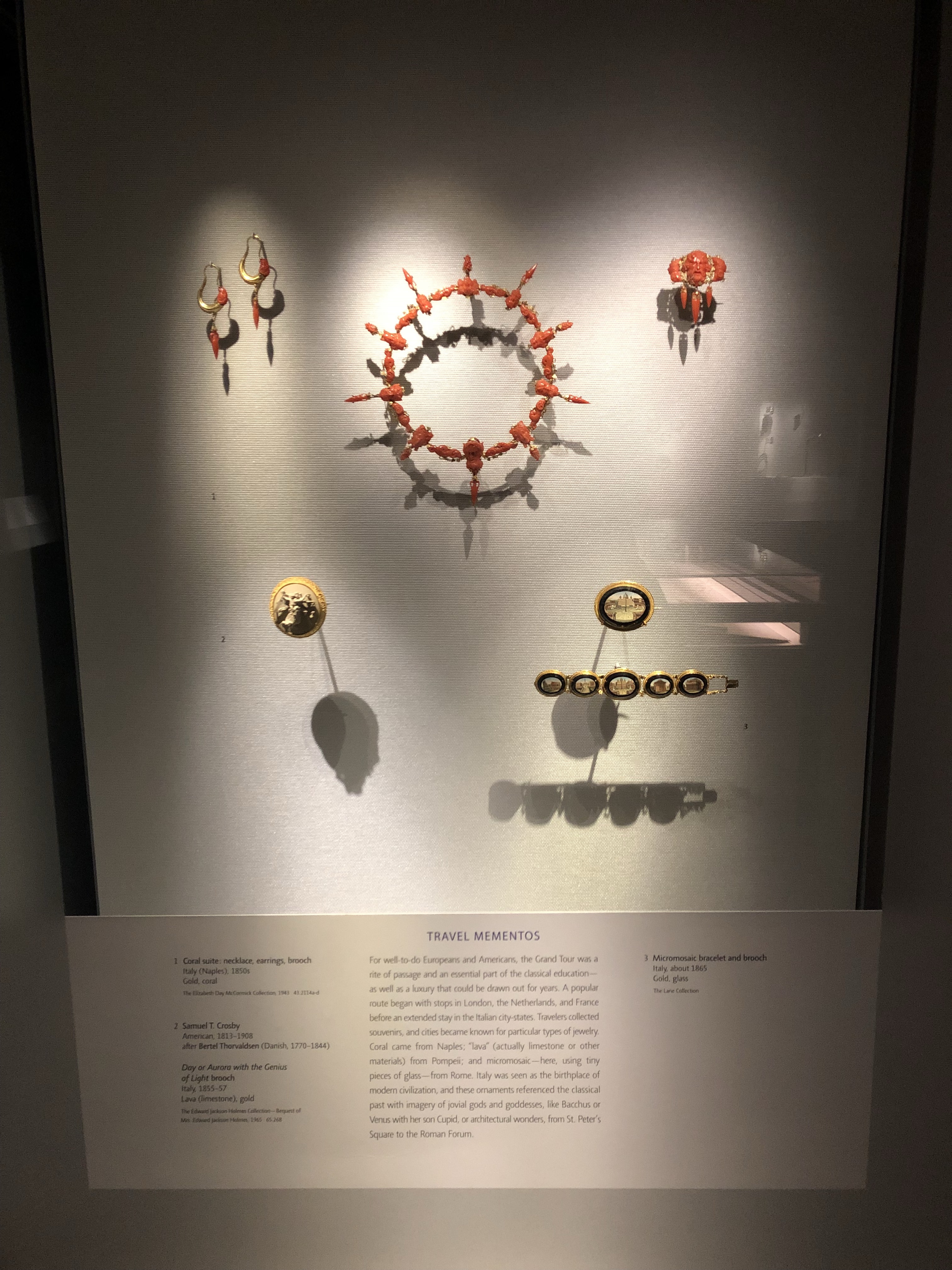 The rest of the exhibition was quite small, only containing around ten cases mounted to the wall and one large case in the centre. Most of the cases displayed ancient/early modern examples with their modern counterparts. There were some stunning pieces on display including a travel bracelet from 19th century Italy. The labels were positioned well inside the case but the font was quite small. A trend I am seeing way too often in some museums.
