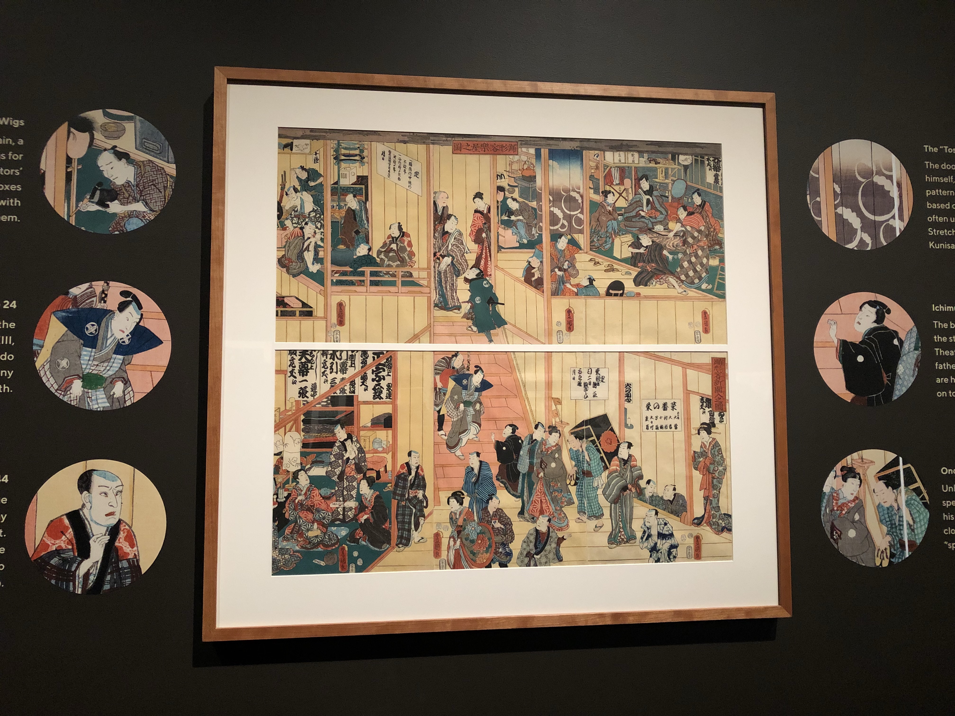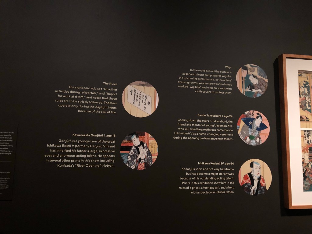 I am going to start by reviewing their new exhibition, Showdown! Kuniyoshi vs. Kunisada. It is located on the lower level of the museum in their special exhibition space. What I found great about this exhibition is it was quite fun and challenged the visitor to more closely assess and evaluate the artwork. The introductory panel sets the scene – Kuniyoshi and Kunisada were rival woodblock print designers in 19th century Edo, now modern Tokyo. They created some of the most beautiful prints in Japan depicting people, most notably kabuki actors. The panel asks visitors to re-ignite the rivalry by the selecting which artist they prefer.