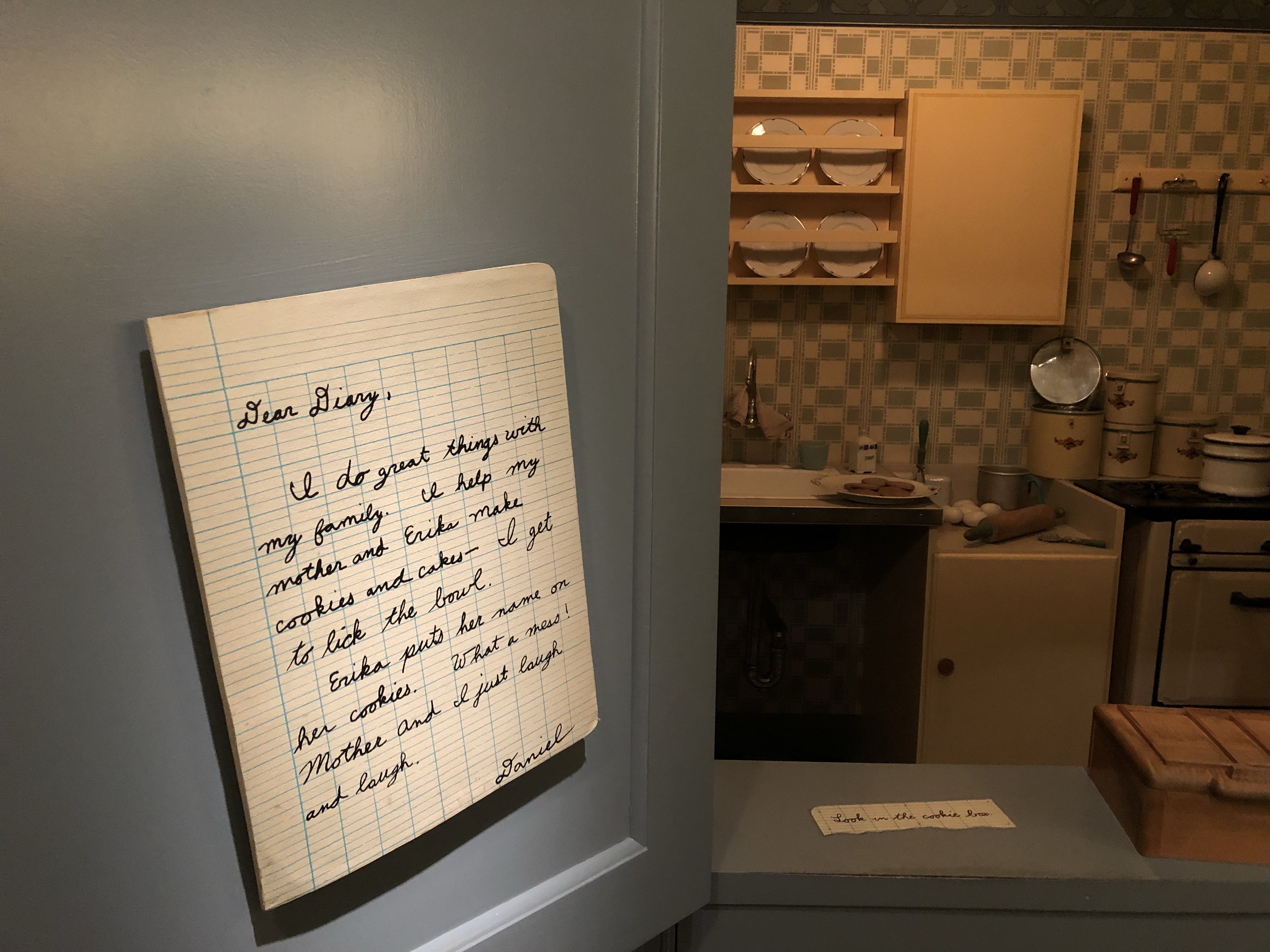 The whole exhibition looks and feels like you are walking through a children’s picture book. The labels are large diary pages with a child’s handwriting telling the story. They were only short, yet allowed for so much information and emotion to be communicated. Often the labels were placed in areas that could be accessed by both adults and children – positioned low on walls or on top of props at a child’s eye level. As the text was so big, adults didn’t have to strain their necks bending down to read.