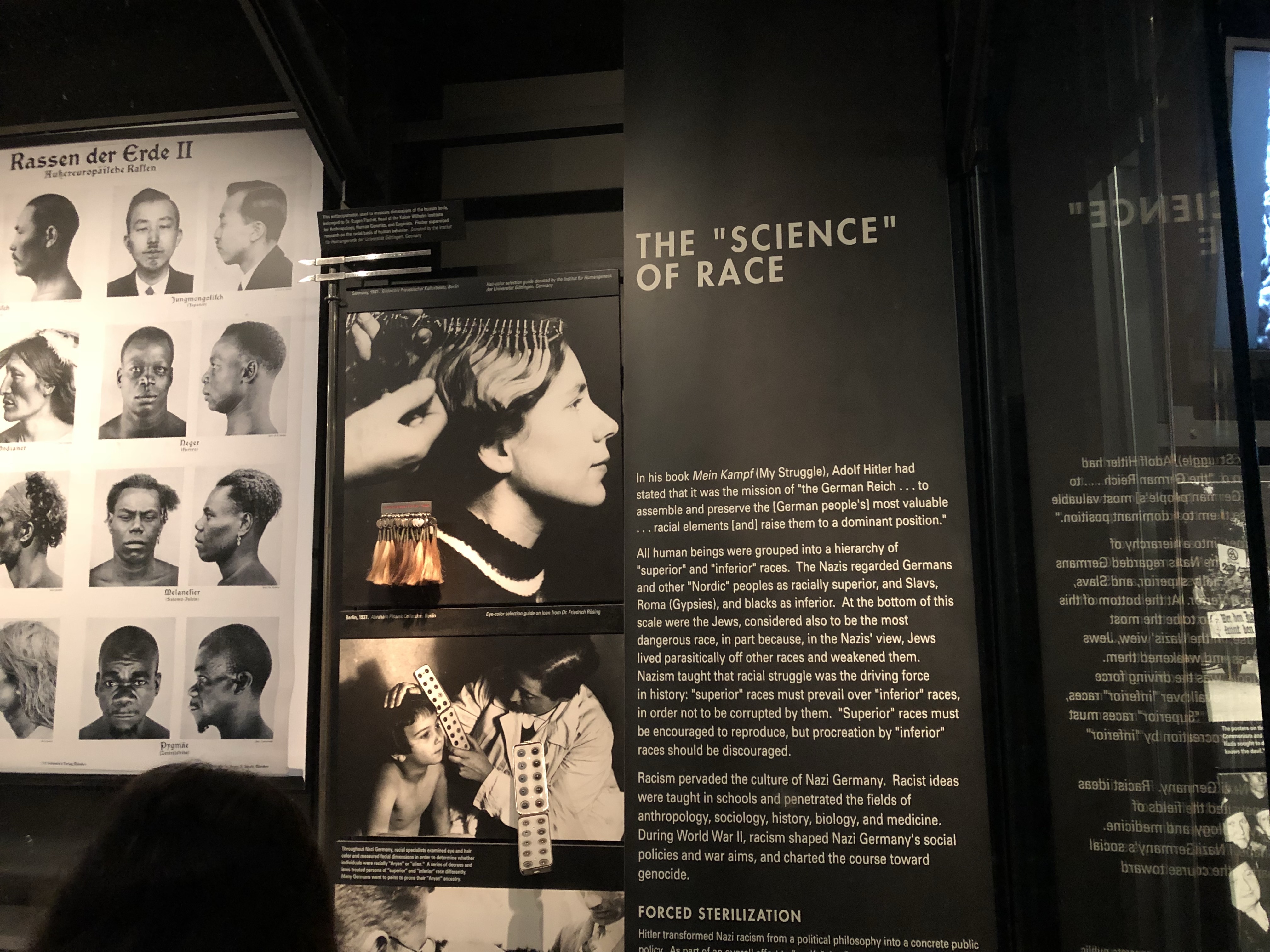 The top floor covers the lead up to the Holocaust and the introduction of systematic segregation. It was unbelievably busy so we tried our best to read as much as we could. From what I could see, the actual displays were so well curated. One section on identifying race had hair and eye samples used to determine race positioned on top of relevant photographs or posters. Each display case had a large thematic panel that covered some of the basic information. Although it was white text on a black background, it was printed large enough to not be a problem.