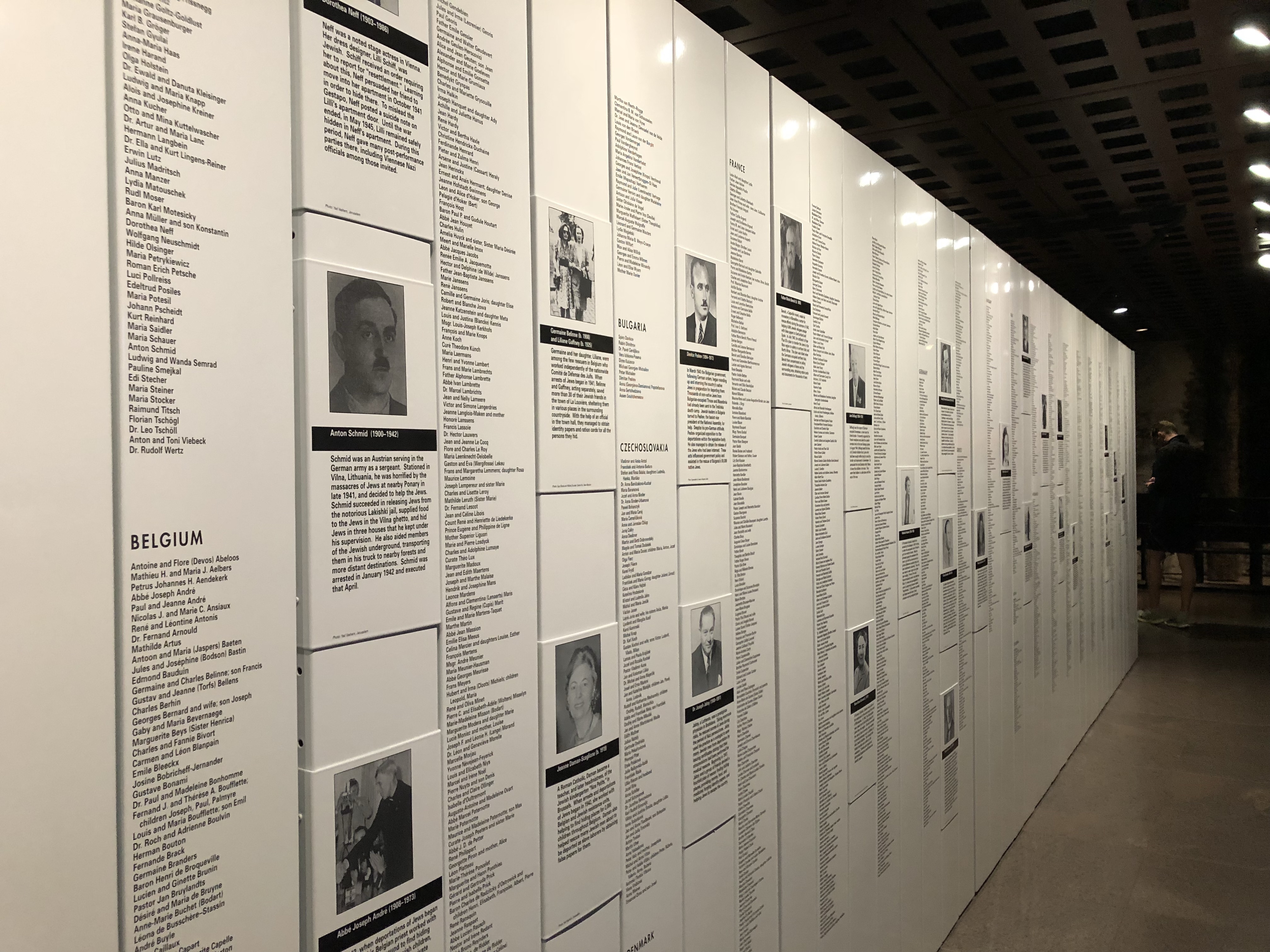 Finally, we made our way to the ground floor which focused on liberation and the aftermath. In the middle of the main exhibition space was a white wall containing the names of those who helped rescue Jewish individuals during the war. It is still a growing and developing project. There were also small displays on resistance including the White Rose Movement from Munich. The exhibition ends with videos of survivor testimonies. We sat and listened to quite a few. There were uplifting stories of people finding each other after the horror. There were also reminders that this history must never be repeated.