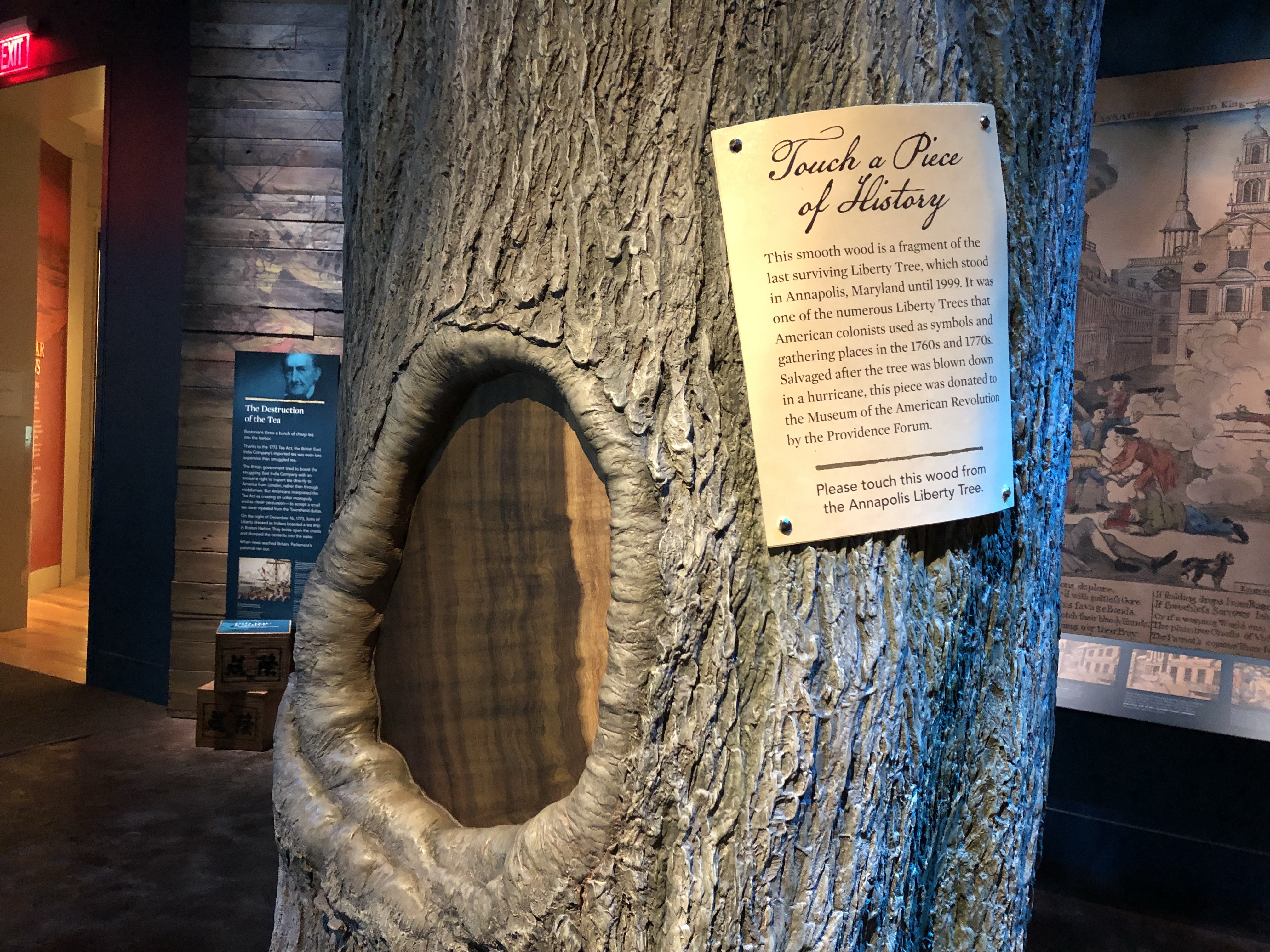 In the middle of the first room was an artificial tree. Part of the trunk was cut out and inside, a segment of the last surviving Liberty Tree. These trees were often used as gathering places for those wishing to discuss dangerous revolutionary ideas. This particular tree was cut down in Annapolis, Maryland in 1999. As the label stated, you were able to touch this part of history.