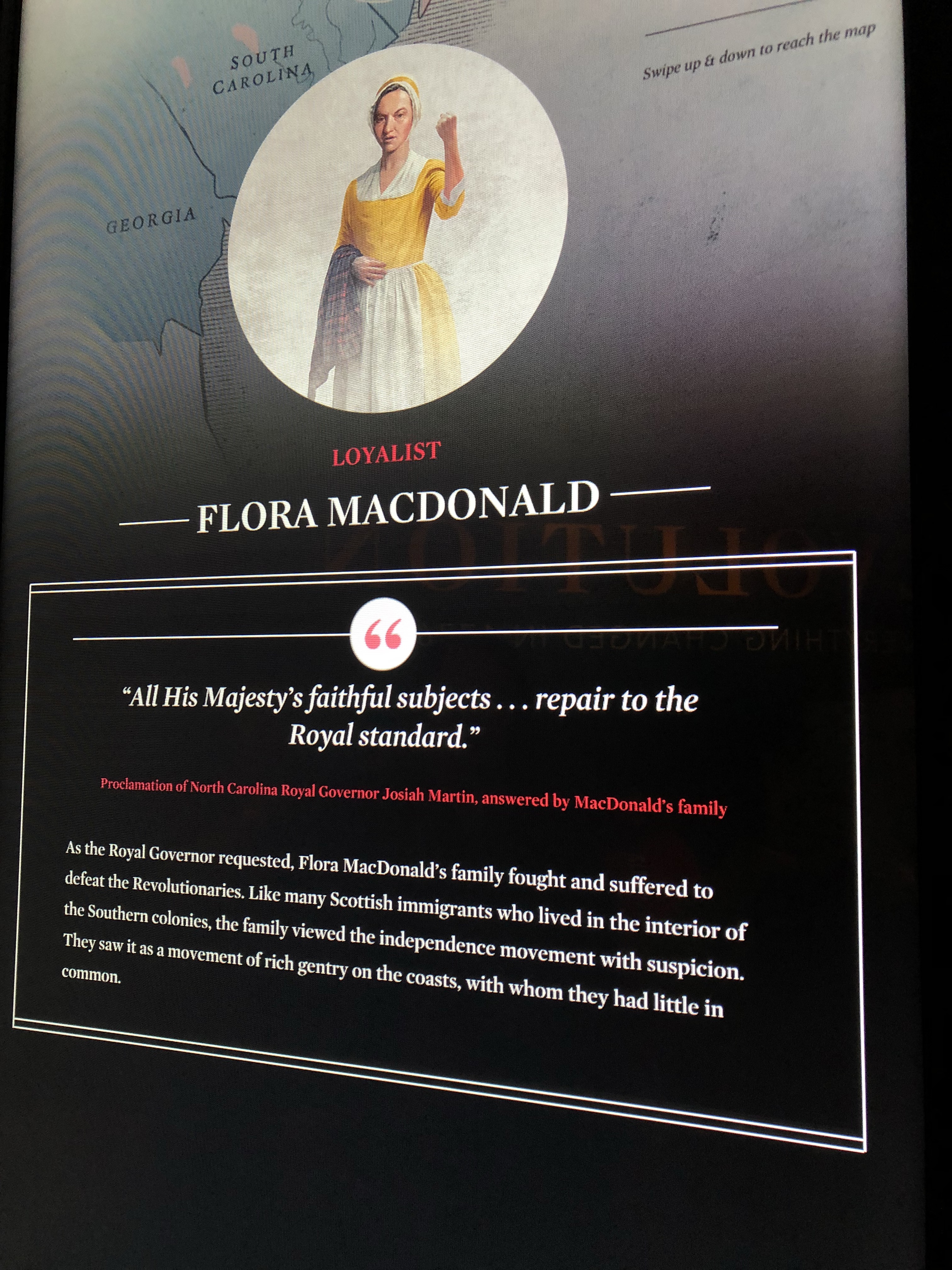 The touch screen also included women who were against the Revolutionaries, otherwise known as Loyalists. Flora McDonald of South Carolina thought the War was just going to benefit the rich gentry in the North. This diversity of stories is what sparked my attention the most.