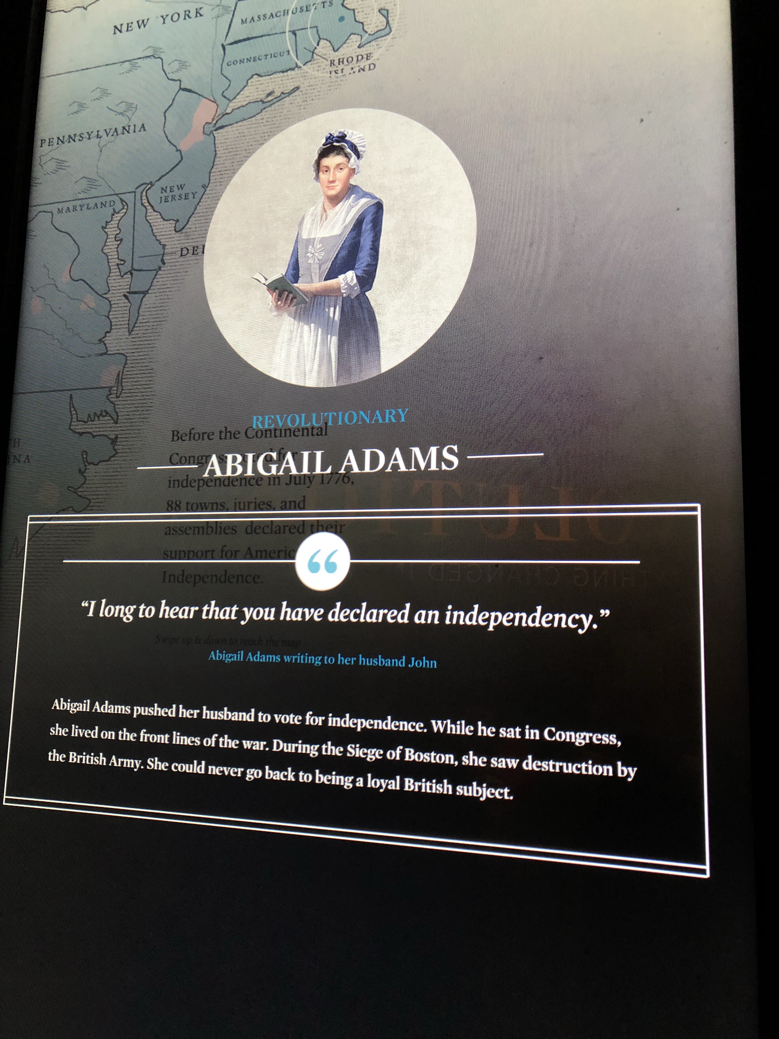 Now it’s time for my favourite interactive screen. As you dragged the timeline at the bottom of the screen, different revolutionary figures popped up in different states. There were a lovely number of females represented on the screen. I had never heard of Abigail Adams, wife of John Adams, or her role in the War. Turns out she had incredibly progressive ideals and fought for the inclusion of women in the Declaration of Independence. Her quotes can be found all throughout the exhibition. She promised her husband that if women kept being neglected they would one day fight for their rights.