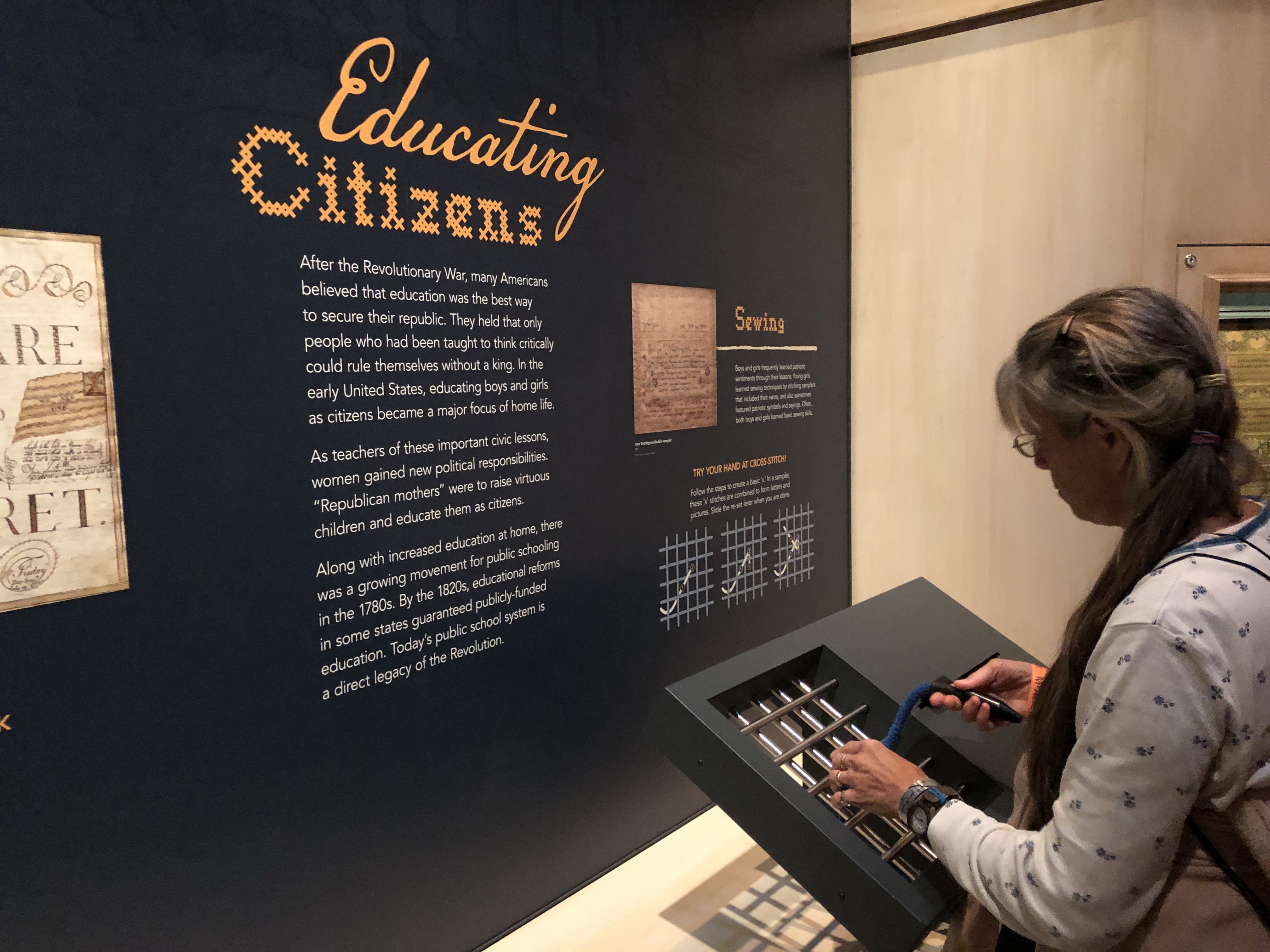 After the Revolution, it was believed that the best way to maintain the republic was to educate its citizens. As part of their general education, both girls and boys were taught basic sewing techniques. For girls, they continued to create samplers often with patriotic symbols alongside their names and the alphabet. Visitors could try and cross stitch a large rope through a metal frame. Teach the world cross stitch is my personal motto so I was thrilled to see this in the exhibition and its importance in early education recognised.