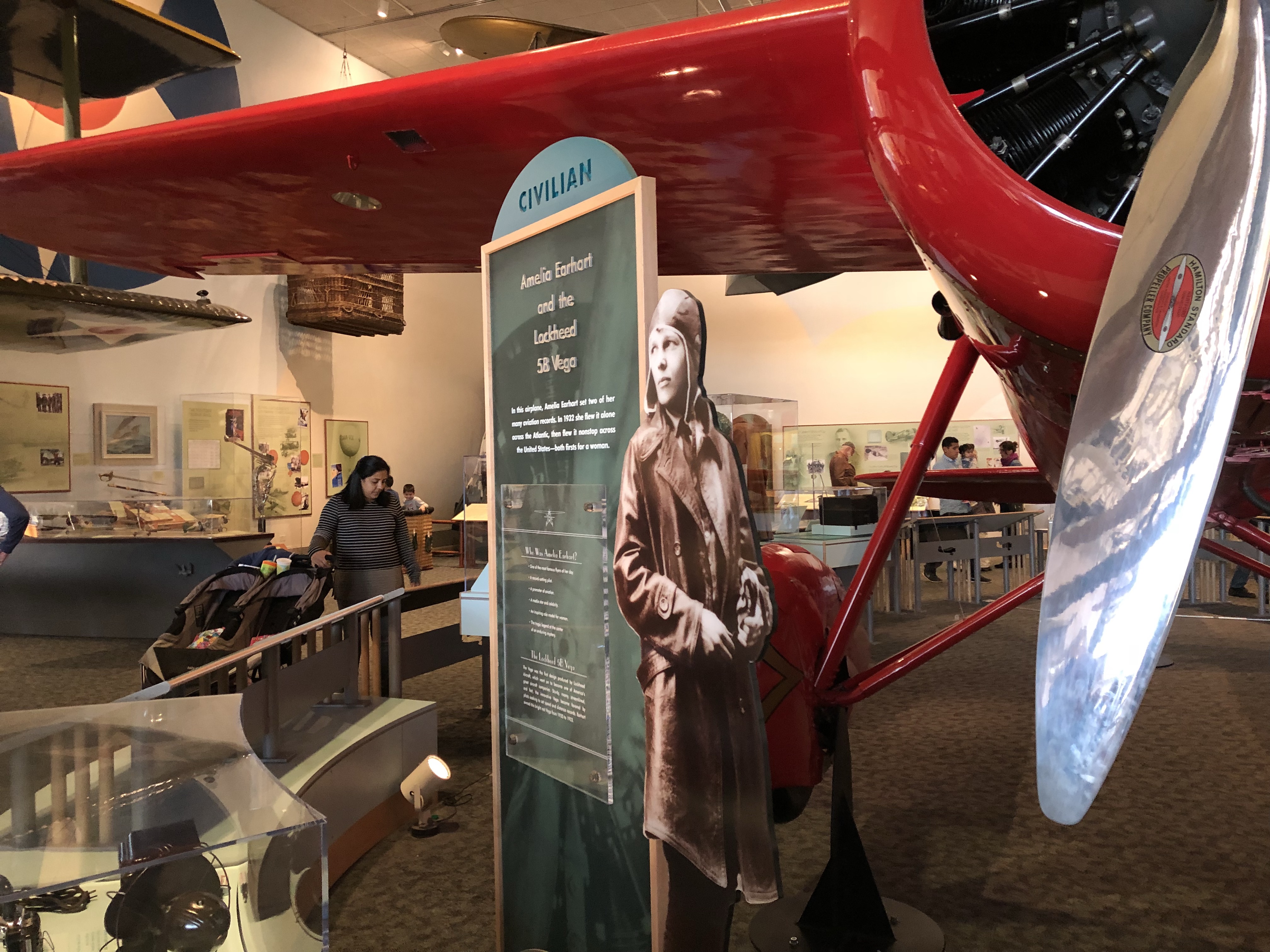 The plane on display was the one she flew coast to coast and across the Atlantic. It is a beautiful bright red plane that is mostly original. Next to the plane were some information panels about Earhart and her achievements. Seeing a female pilot so prominently featured in the exhibition filled me with joy!