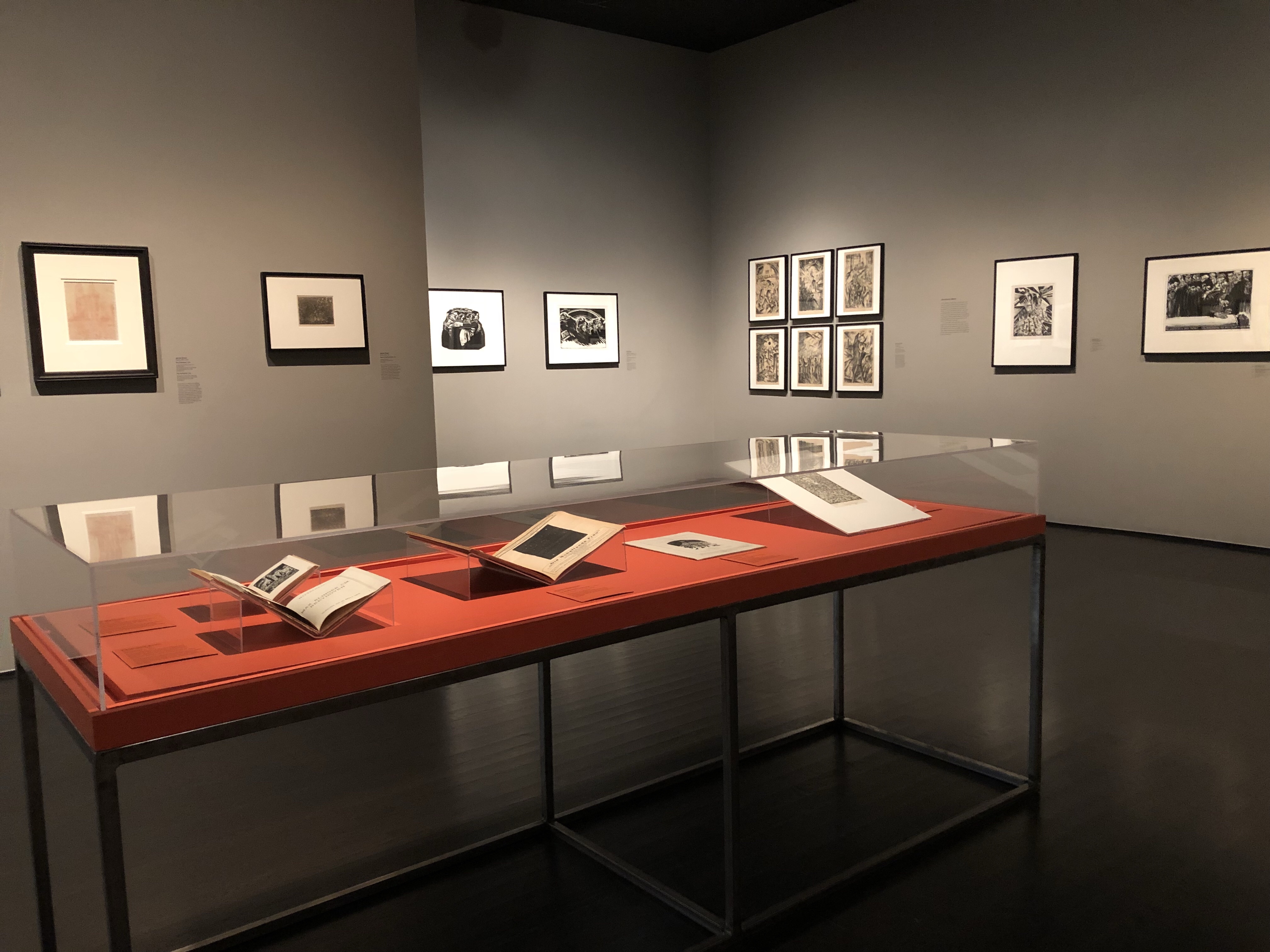 The contrast between the red in the display cases and the grey walls aesthetically suited the works perfectly. Almost every work was on paper in either black or white, or muted colours. The only two exceptions were the works by Cesar Klein and Max Pechstein.