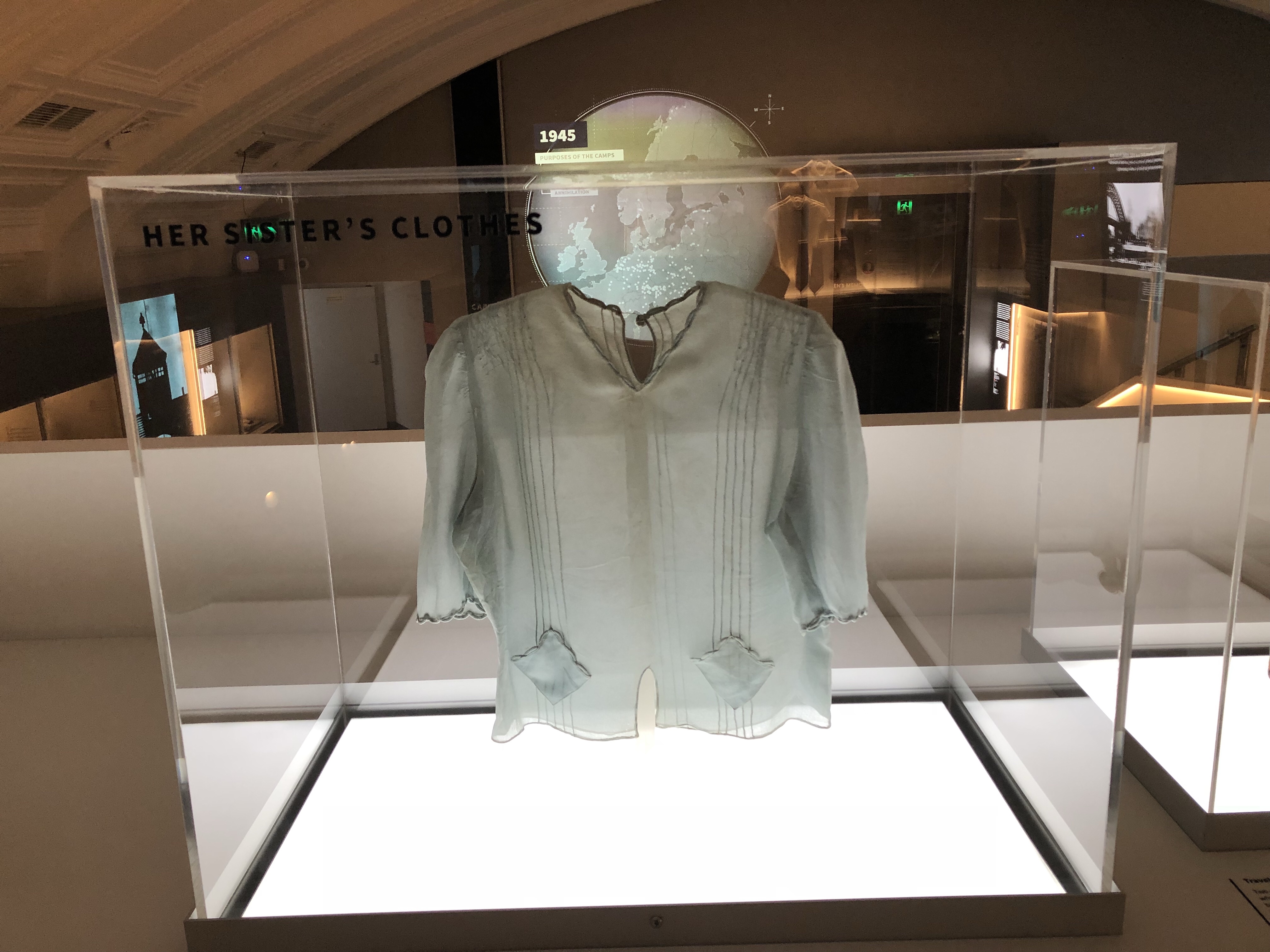 Displayed floating in a clear box is this blouse that belonged to a sister of Hela Stein. Her four sisters did not survive and she is unsure of who this blouse belonged to. The object became a memory and something that Hela held onto for many years. It reminds visitors of the emotions that we can place on physical objects and the memories they can evoke.