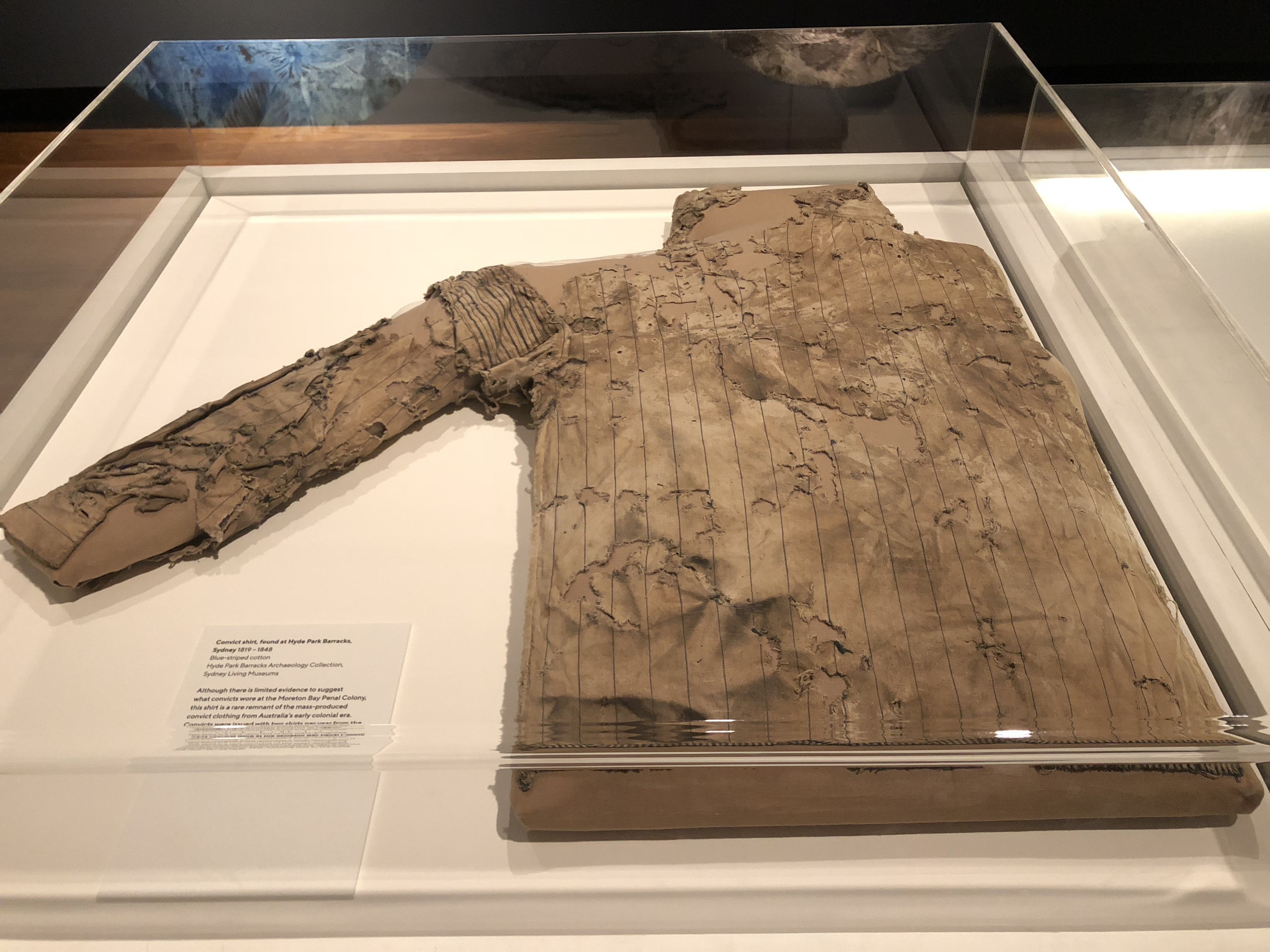 There was a convict uniform on display that had been excavated underneath Hyde Park Barracks in Sydney. Without reading the label, it would be easy to assume this material memory had survived. Unfortunately, however, no uniforms have survived from Moreton Bay and it was on display as an example of what the uniforms may have looked like.