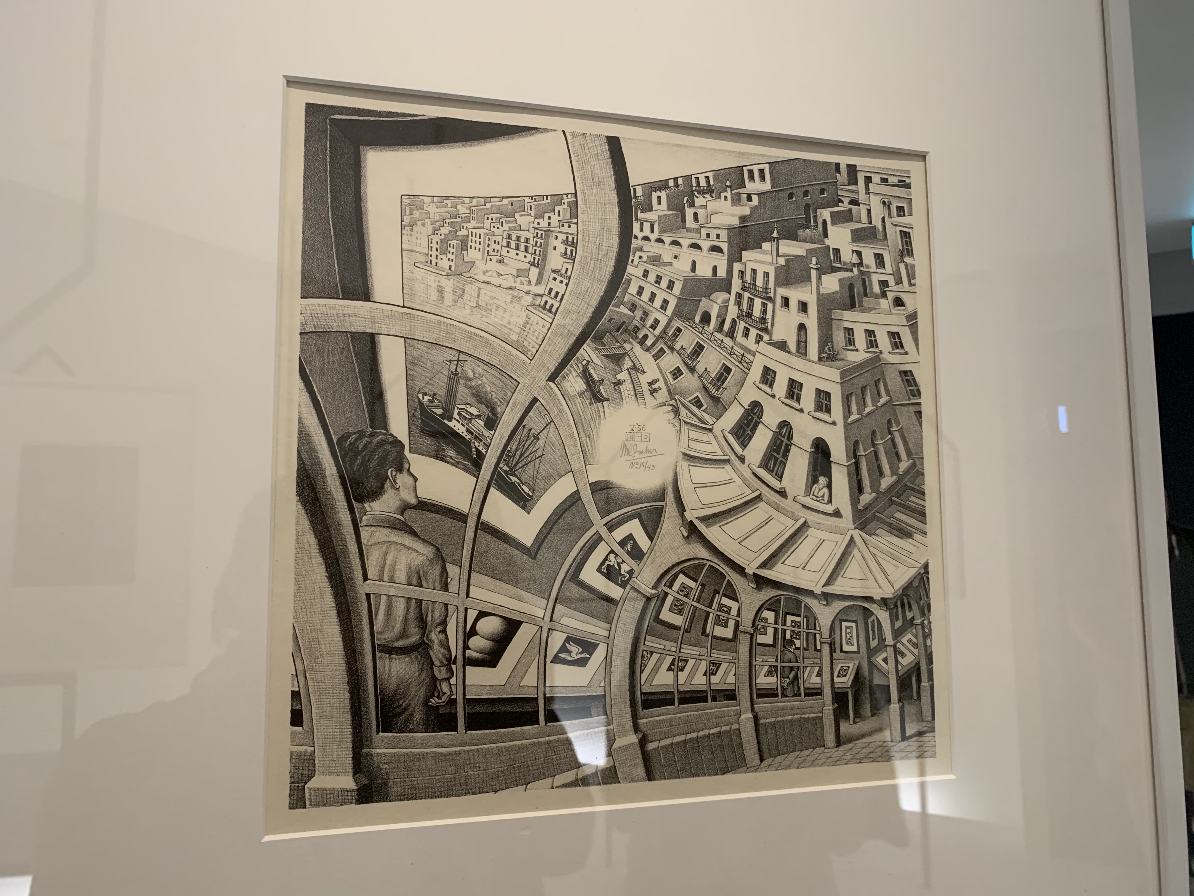 This is the print at the end of the exhibition. It is an incredible print that appears as though the hands are drawing each other. One of the most pertinent examples of how Escher matured and perfected the optical illusion style.