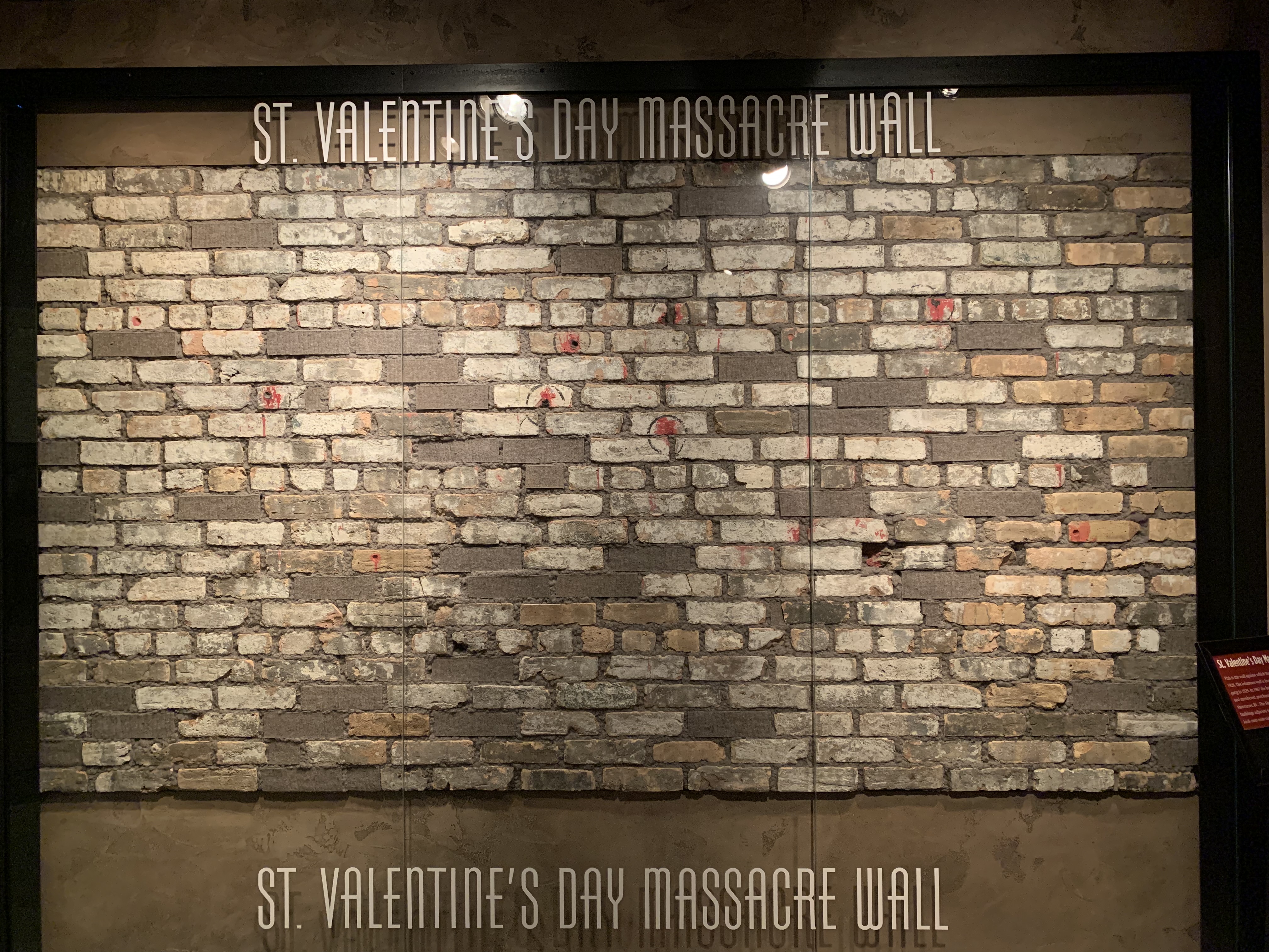 On 14 February 1929, Bugs Moran’s men were shot against this wall in Chicago. Moran was a Chicago gangster and the hit is believed to have been ordered by Al Capone (jury is still out). The possible aim, to stop inter-gangster warfare. The building where it happened, SMC Cartage, was demolished, but, the wall was saved by businessman George Patey. He took apart the wall brick by brick and gave each a number so it could be rebuilt. His family later donated the entire wall to the Museum.