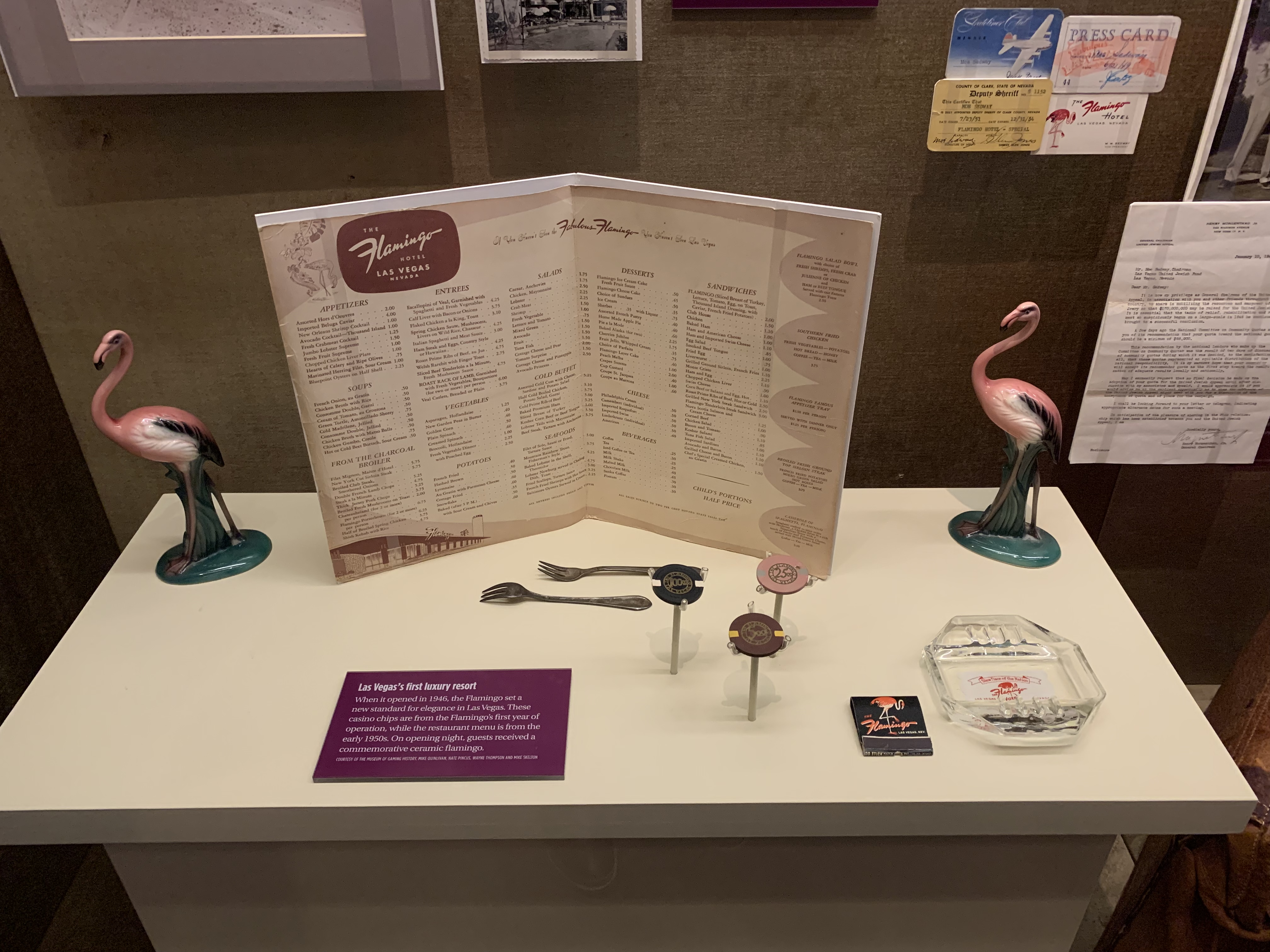 Dubbed the first luxury resort in Vegas, The Flamingo opened in 1946. This menu is from the early 1950s and the poker chips are from its first year of operation. It was custom to also present a ceramic flamingo to each guest upon departure.