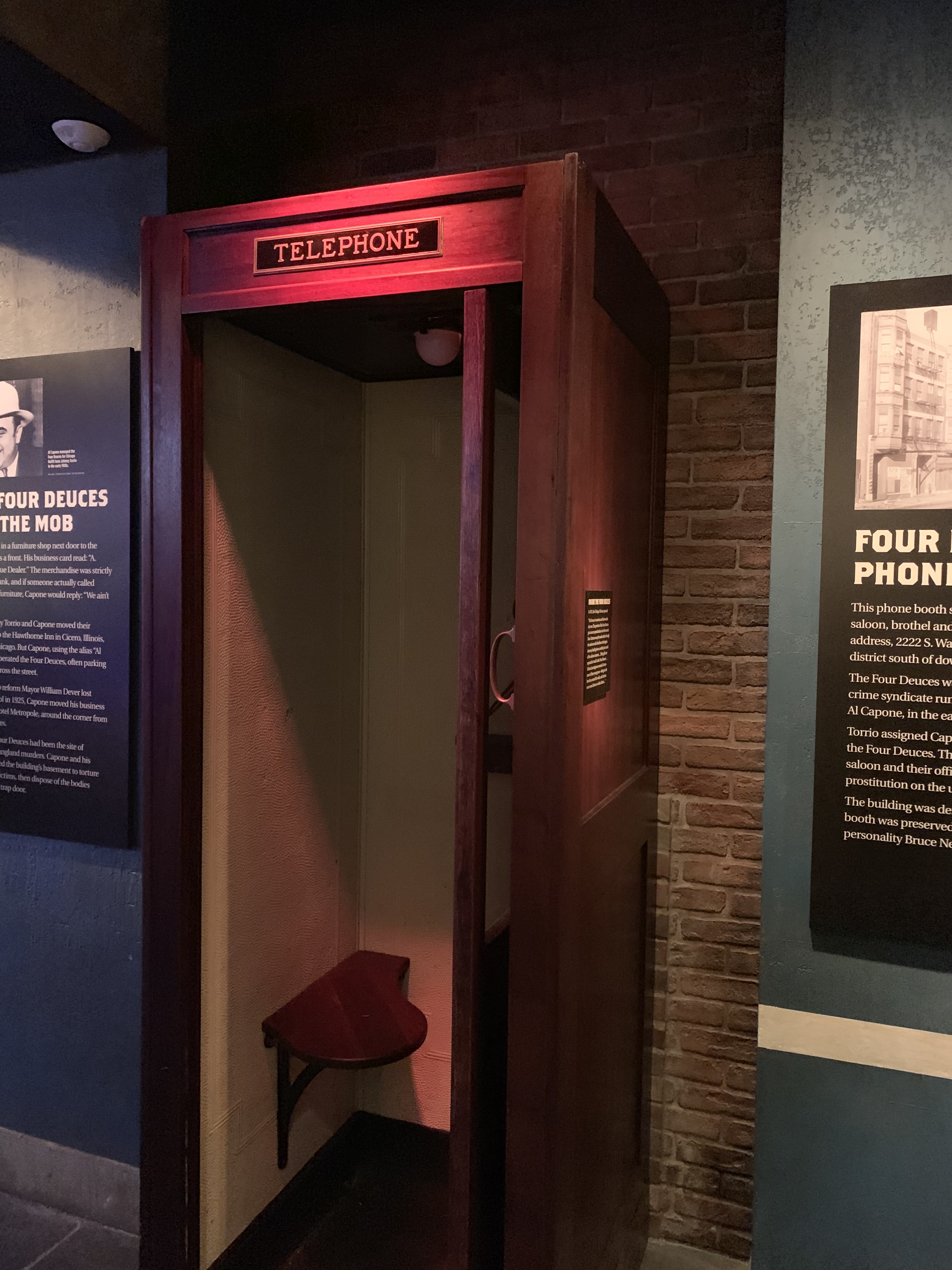 This phone booth once stood outside the Four Deuces in Chicago. This was the headquarters of the Chicago crime syndicate that was led by Johnny Torrio and Al Capone.