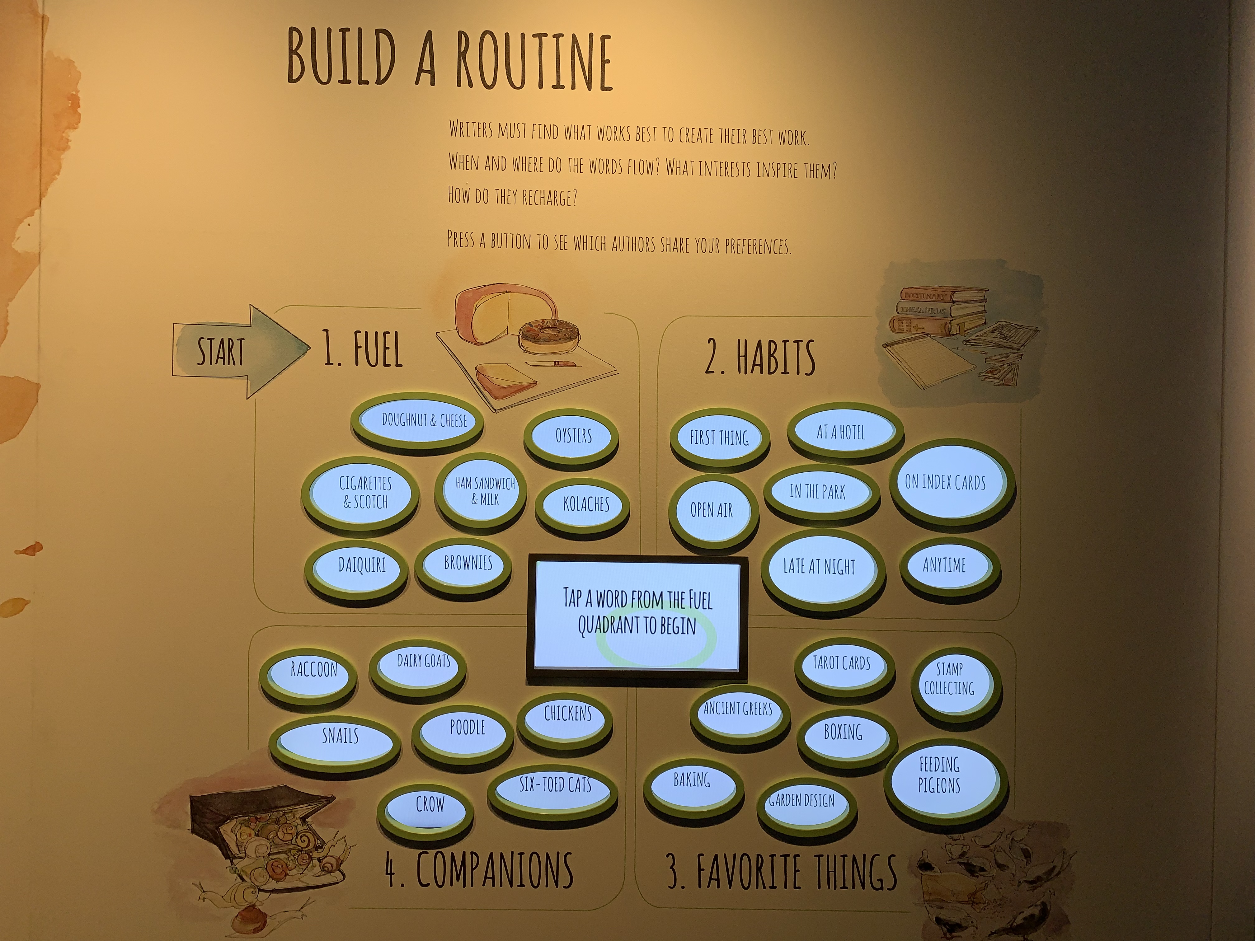 The Museum is all located on one level. The exhibitions are organised so that you start where you purchase your tickets and work your way back around to the entrance in a circle. There are five permanent displays and a temporary exhibition space. This post will cover interactives in A Nation of Writers: John and Cathie Estey and the Mind of a Writer Gallery. I didn’t find the interactives in the other three permanent display areas as engaging.