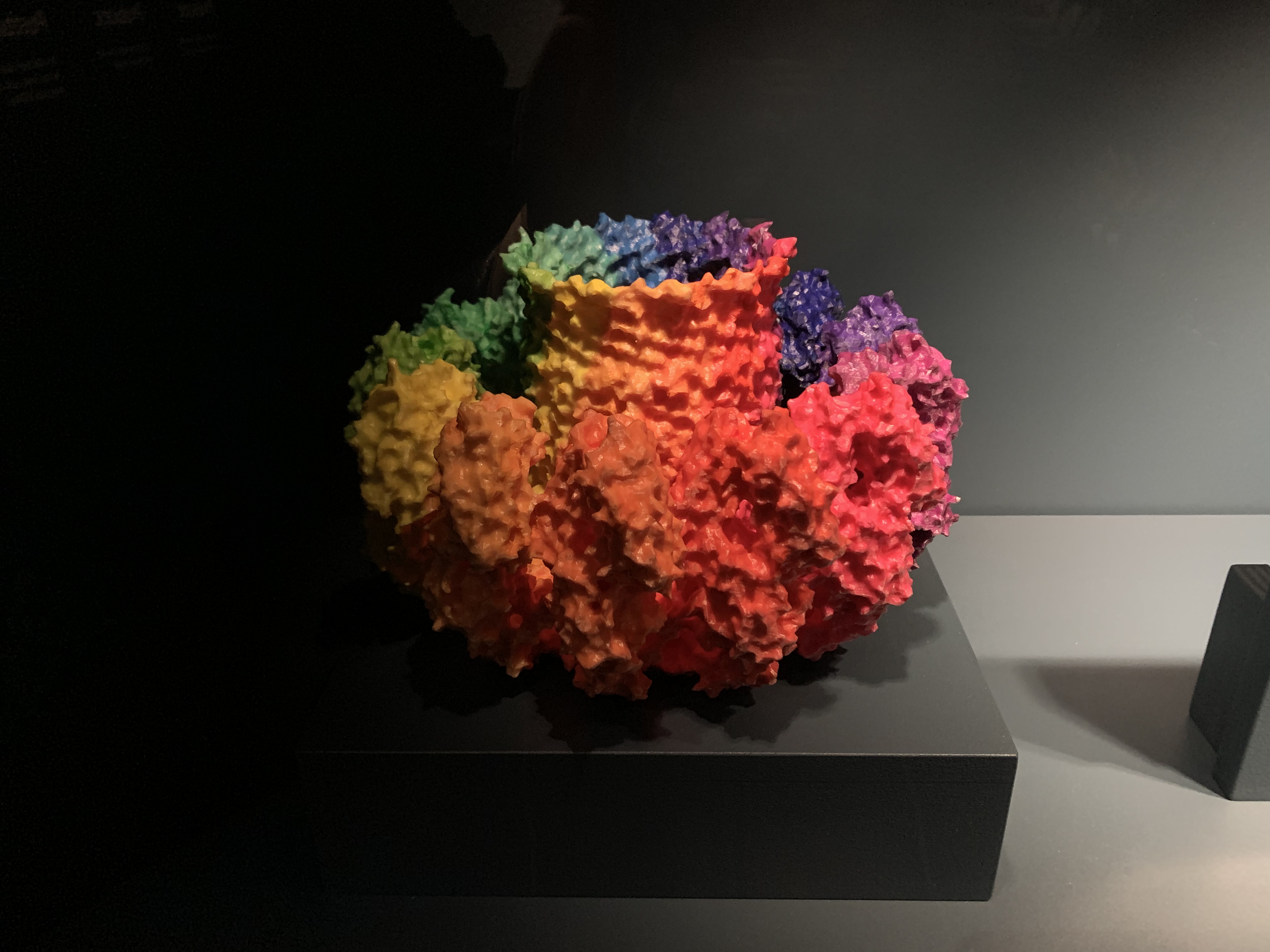 Also in this space was my favourite object, 3D printed bacterial molecule perforin. Essentially, a rainbow molecule. The object label highlights three therapies ‘beyond antiobiotics’ – molecular therapies, immunotherapies and phage therapies. The latter has an amazing story attached of a man who was saved by extractions of phages from sewage.