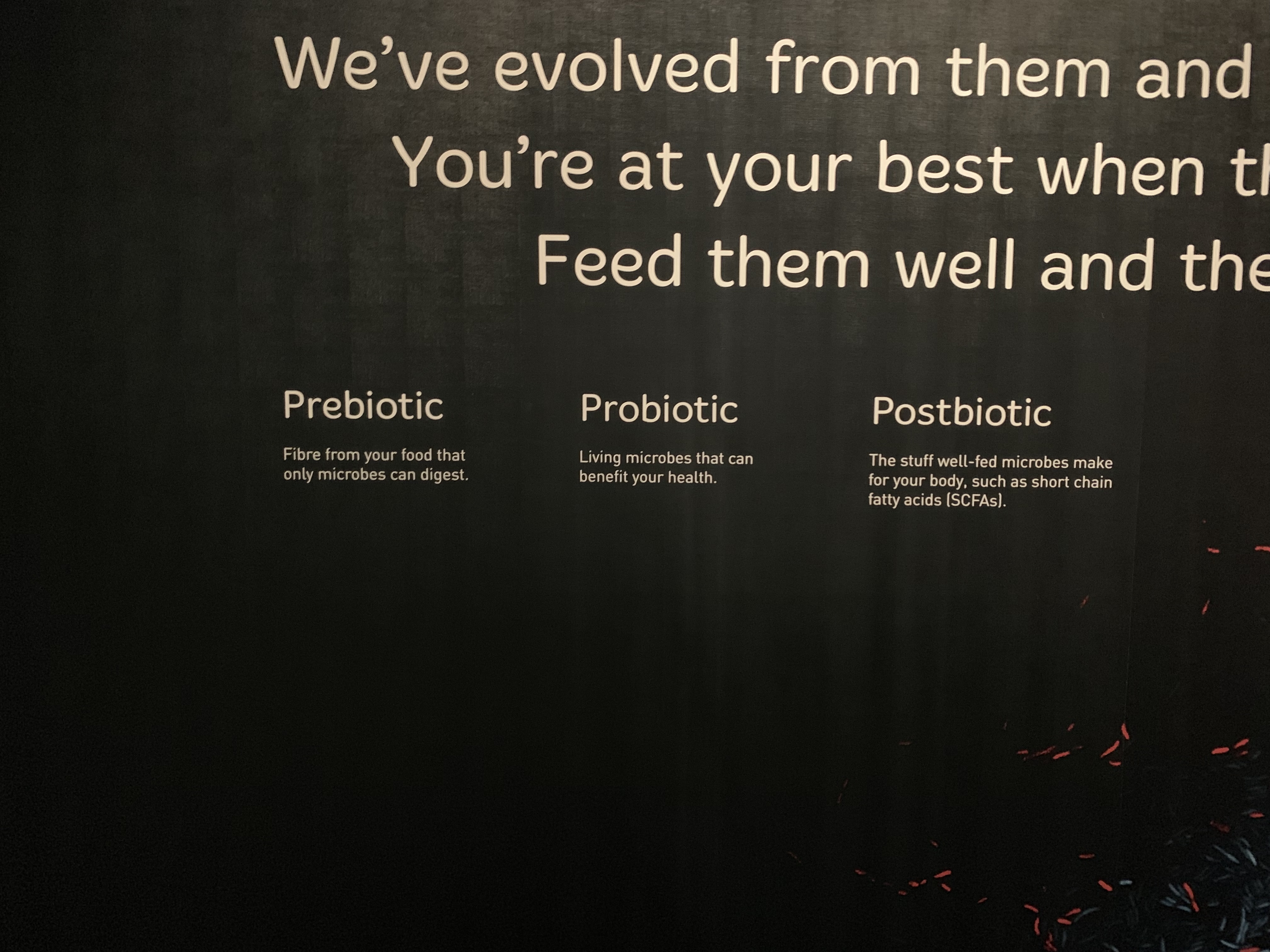 My favourite room consists of a touch screen in the centre where you can drag different foods into a Petri dish-like shape to see what microorganisms they contain. Behind the screen, printed on the wall, are definitions for three words: prebiotics, probiotics and postbiotics. It was really interesting to see exactly what each word means and get that clear in my head.