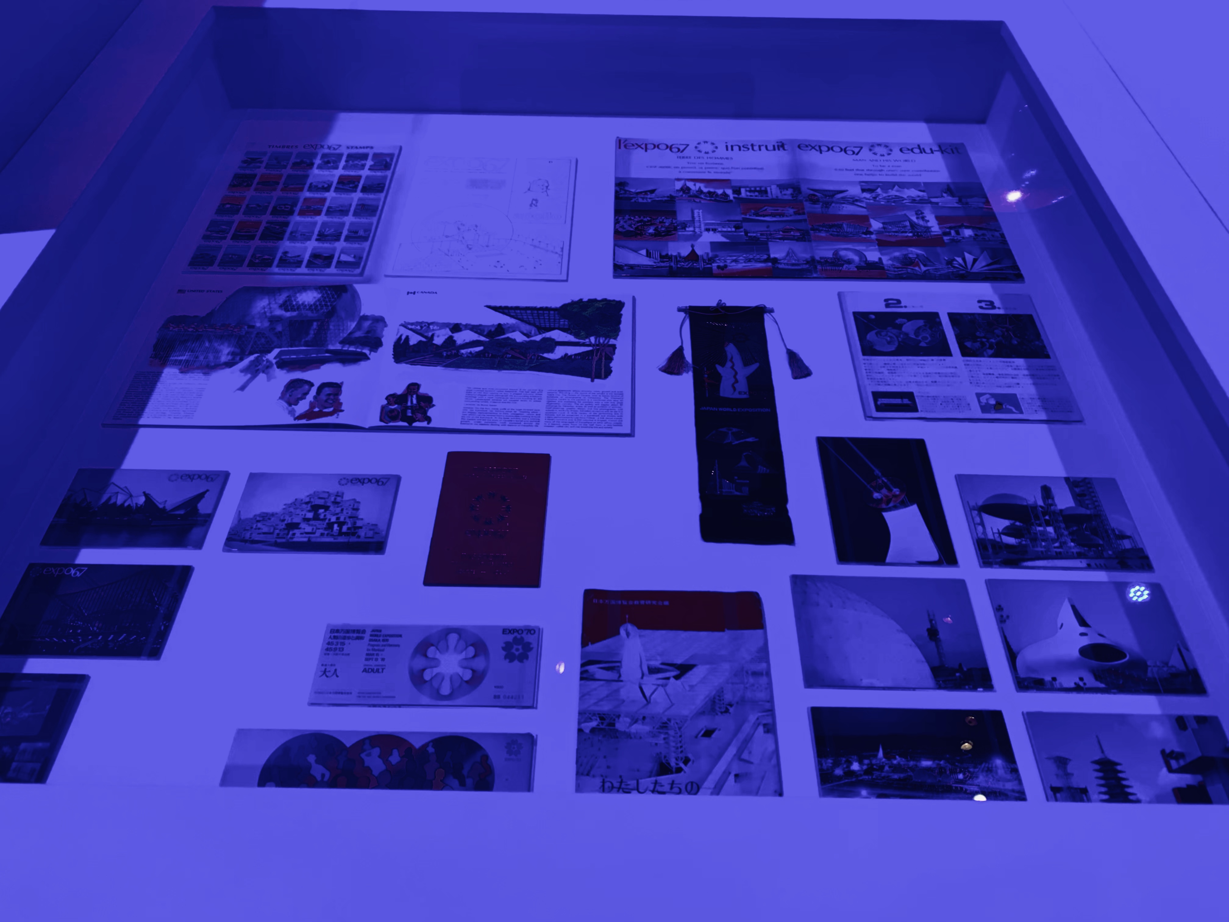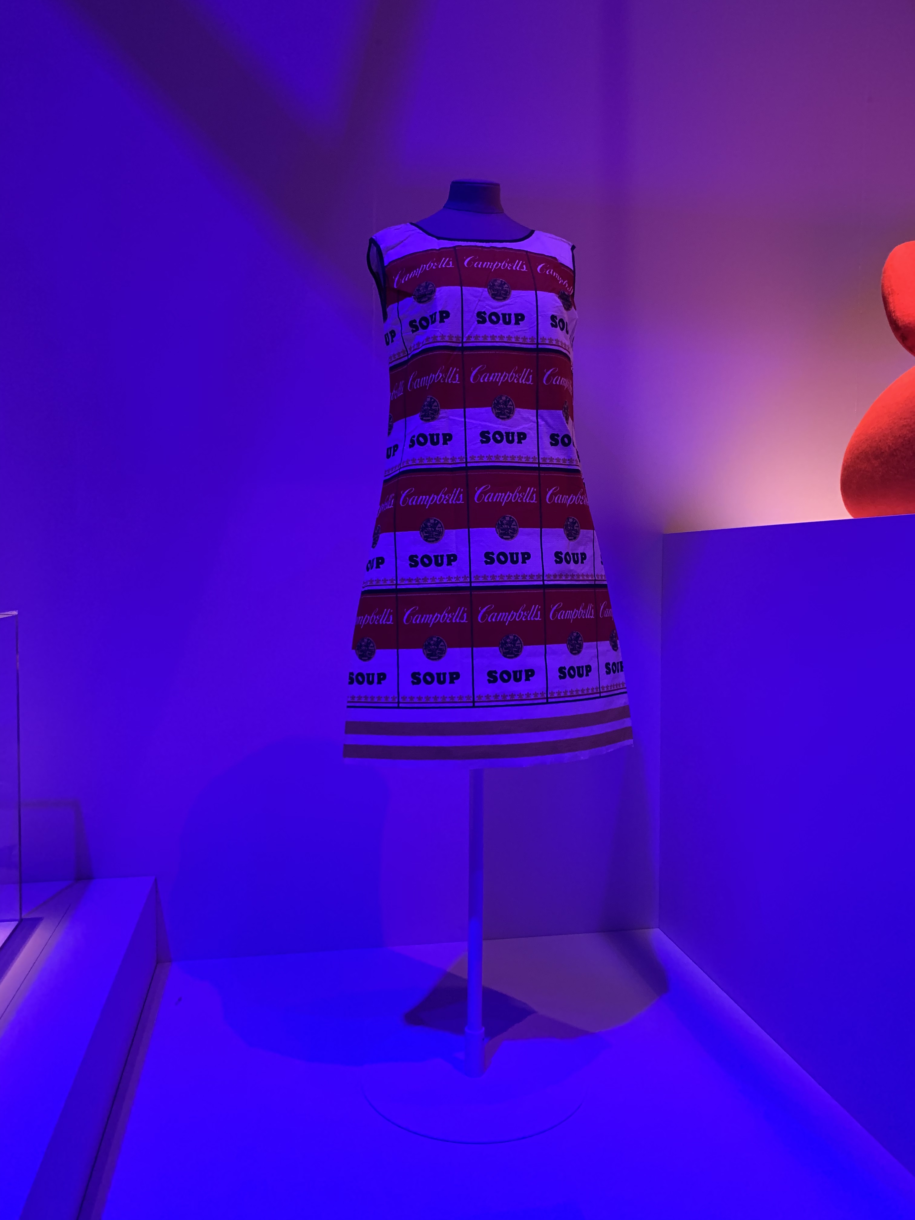 It was near impossible to take photographs in the rest of the space as extremely vibrant blue lights meant all images came out royal blue. I’ve tried my best with photo-editing software to normalise the following two images: one of expo material from 1967 and 1970, and one of the Souper Dress from 1966.
