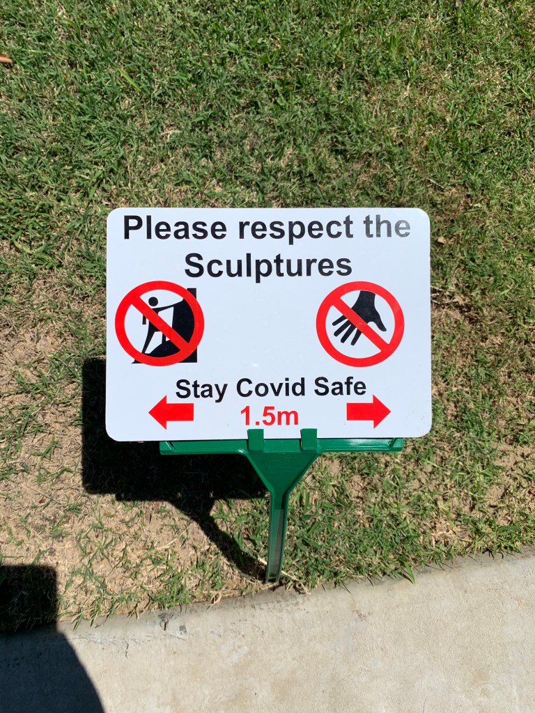 The sculptures aren’t spread out over a large geographical area. However, they are spaced out enough for a decent half hour walk (if you read all the accompanying signs). The signs were sometimes difficult to find, but were at least black text on a white background. If you are wanting to ensure you don’t miss any sculptures, I highly recommend visiting the website and downloading the brochure before you arrive. It also provides some great ‘how to get here’ tips. The exhibition is also, of course, ‘Covid Safe’ as it’s outdoors with plenty of room between the sculptures and lots of visible signage.