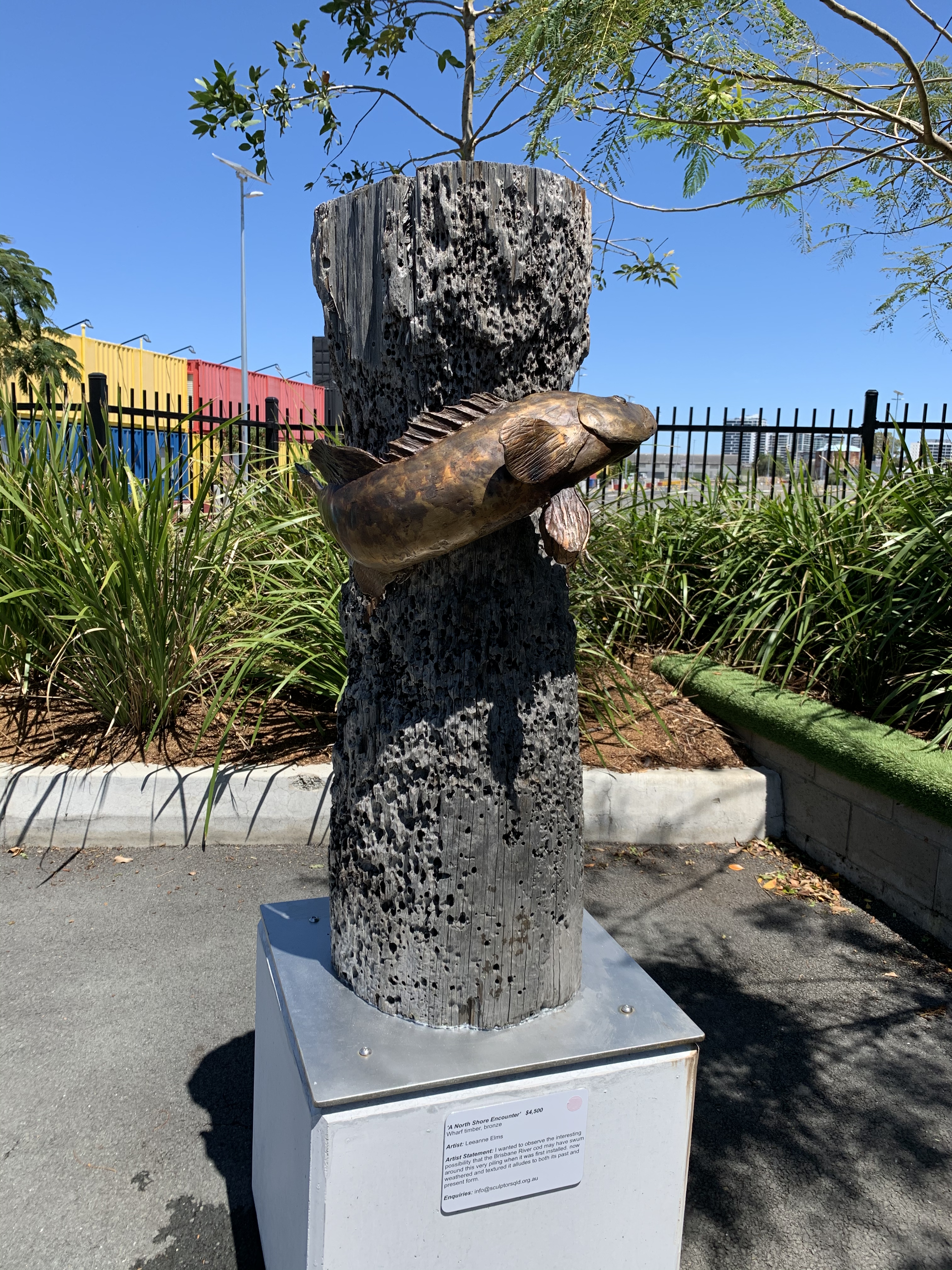 This sculpture combines heritage material, original wharf timber, with an insight into the past. Brisbane River is home to a particular type of cod, depicted in this sculpture as swimming around the piling. Although so much has changed in Brisbane, this cod has, and will hopefully, continue to be a part of our environment.