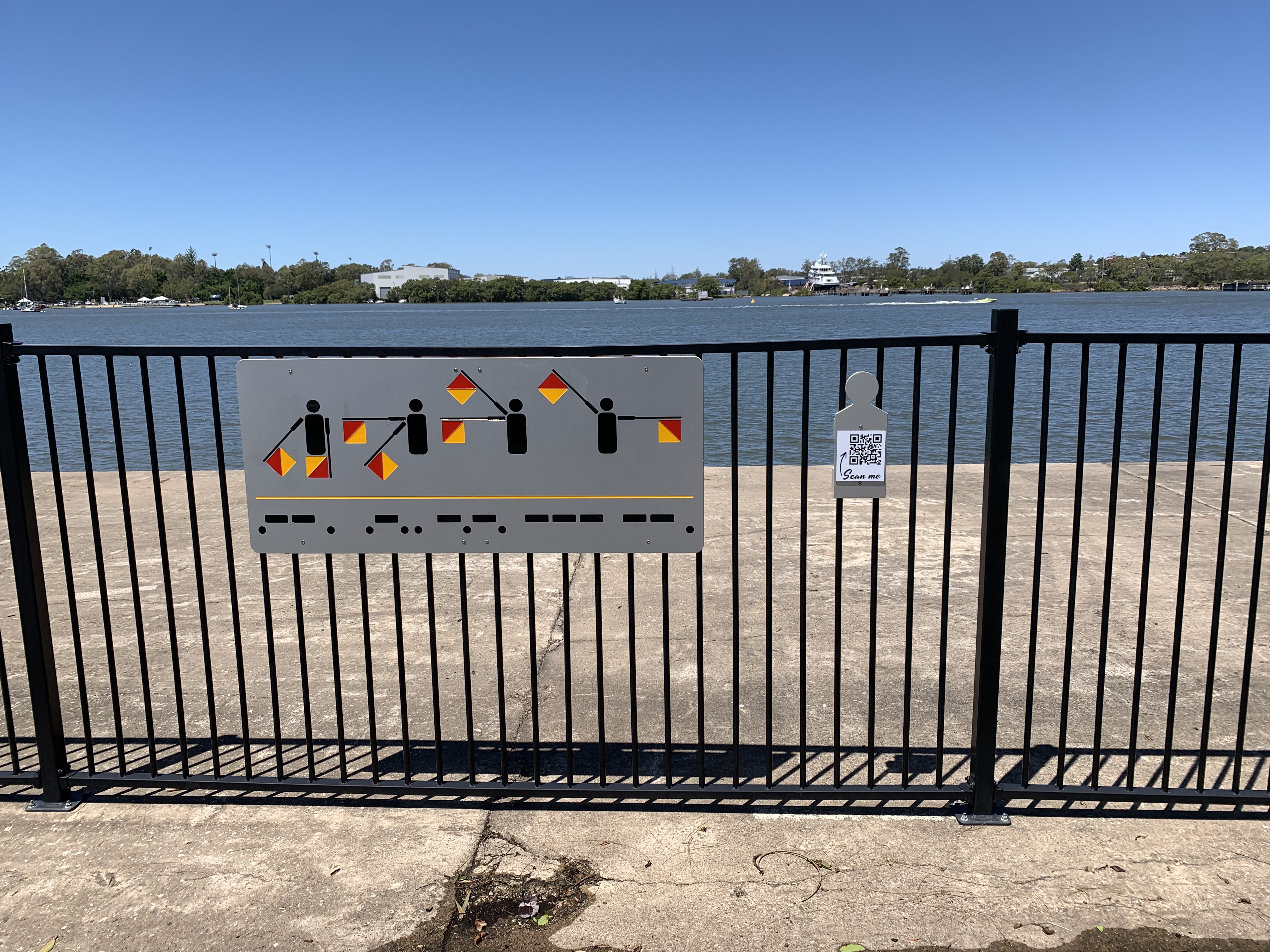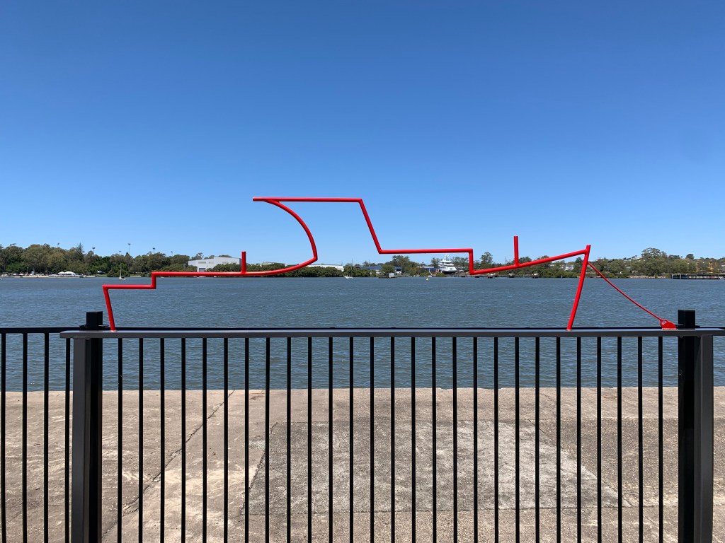 I love this sculpture because of the line work and its simplicity. What you can see is the outline of an old line boat that was built in Bundaberg and moved to Brisbane to assist with transporting bow and stern lines from other ships to the shore. The red is a perfect contrast to the scenery you can see through the sculpture – blue river and greenery on the other side.