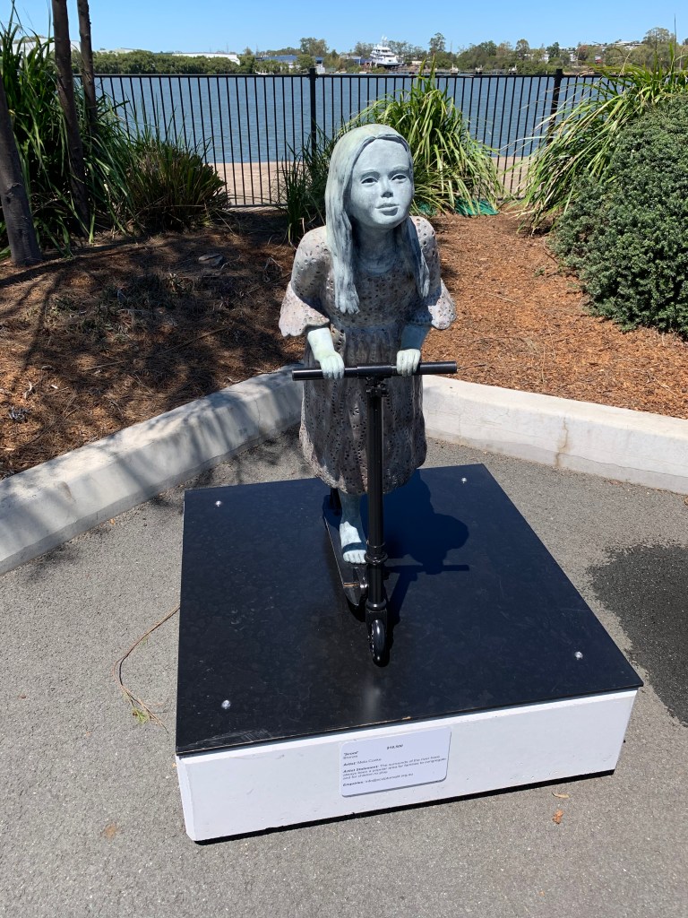Last, but certainly not least, is another bronze work by Mela Cooke. Similar to the dogs, there is so much detail in this sculpture depicting a young child riding a scooter. This sculpture represents how the surrounds of the Brisbane River are filled with parks and areas to enjoy activities such as scooting around.