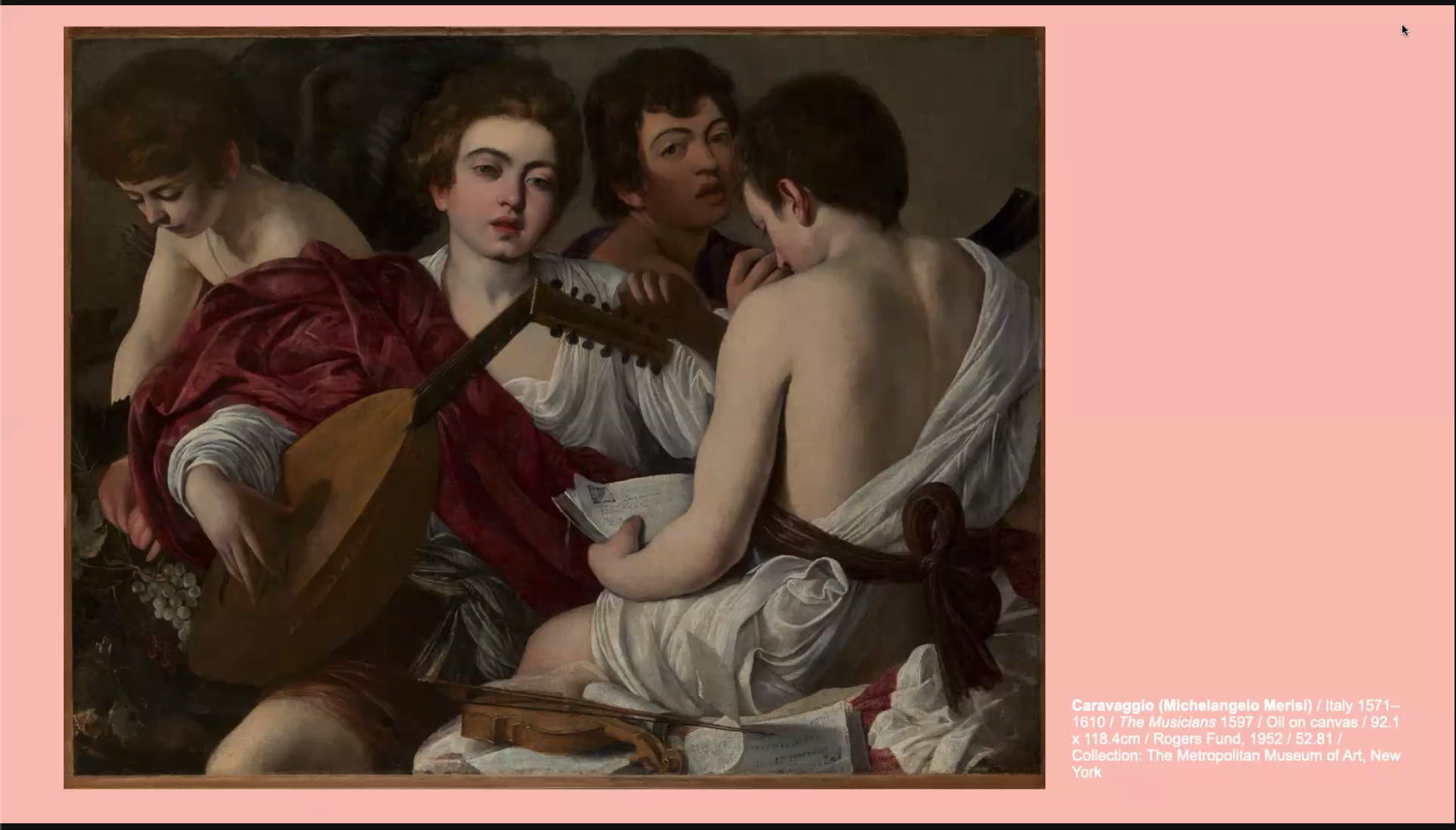 We then moved to Caravaggio and his artwork ‘The Musicians’. Side note, when I visited this exhibition with friends we nicknamed this ‘The Beatles’. Caravaggio is a master of conveying emotions in art. This artwork could represent allegorical concepts or four of the senses, we will never know. What we can see, however, is that this can be read as a sexually provocative painting blurring some of the lines between what is deemed masculine and what is deemed feminine. It is a powerful piece of art for the LGBTQIA+ community as Caravaggio is now known to have been bi-sexual. This artwork speaks to that, representing desire for men.