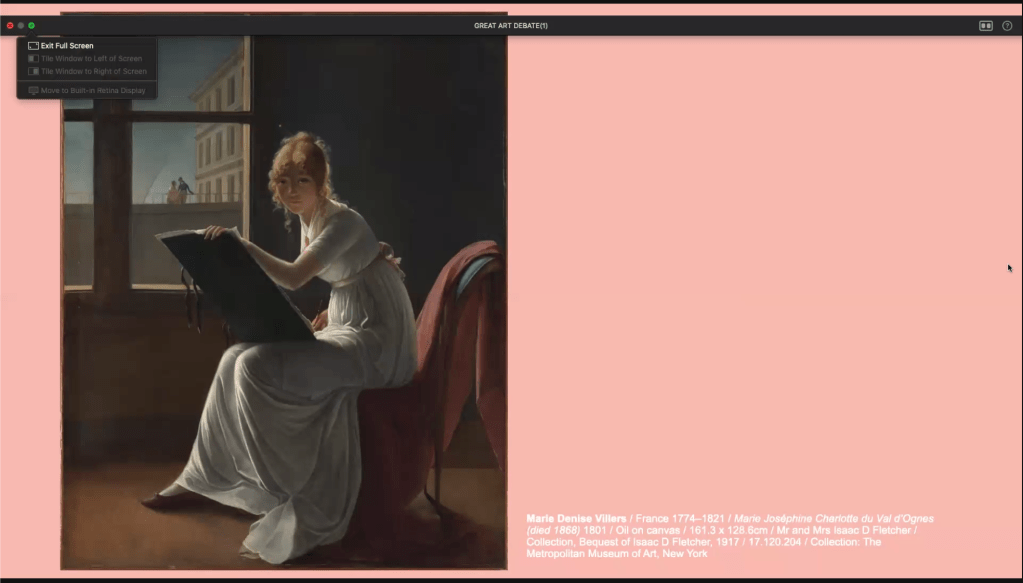 Next was an artwork by Marie Denise Villers. Originally attributed to a man, this was revised and Villers discovered to be the real artist. It is a stunning portrait with great attention to shadows and light that draws you in. What McGillivray argued with this artwork was how classical art can convey mystery. There is a crack on the window pane. Why is it there? No one knows. It reminds viewers that what we do today is not always universally comprehensible and it is not guaranteed that those in the future will understand its significance.