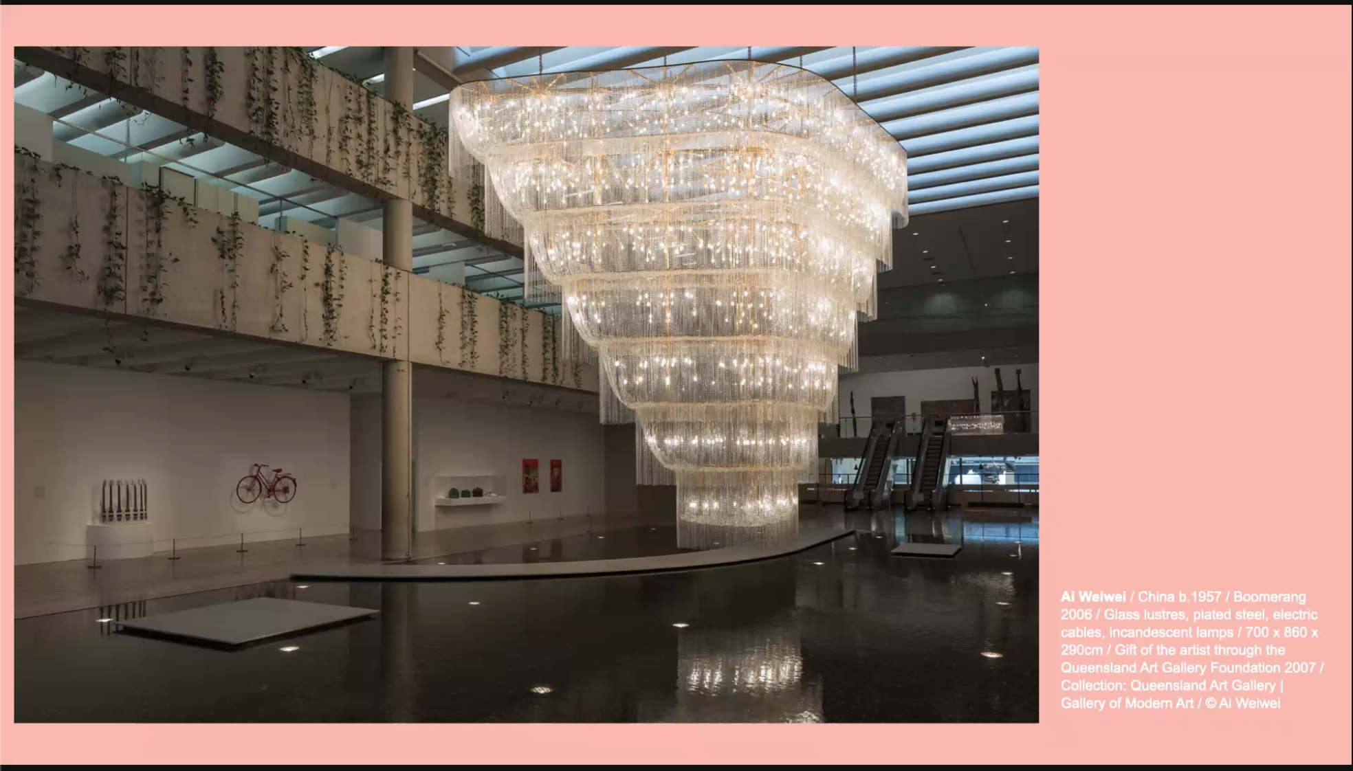The first artwork is this gorgeous chandelier by Ai Weiwei titled ‘Boomerang’ that hangs in the Queensland Art Gallery. It is a destination artwork, donated by Weiwei when he was right on the cusp of fame. Chandeliers play with light to produce wonder and delight and have been doing so since back in the Medieval days when they were a symbol of luxury and wealth. Why does this artwork draw crowds every year? Because of its beauty and size. You are invited to stand in a moment of grandeur, admiring the art and feeling emotionally connected.