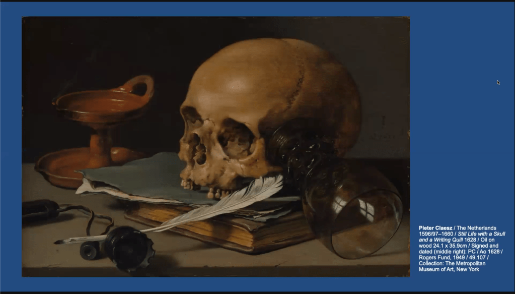 In this round, McGillivray first showed my favourite artwork in the European Masterpieces exhibition, ‘Still Life with a Skull and a Writing Quill’ by Pieter Claesz. There is a skull so it won me over. I had no idea that it was a memento mori painting – or a painting that is created to remind the viewer they will die. Unlike the western cultural understanding of death today (something to be feared) in the 17th century death was not an unhappy talking point but was at the forefront of people’s minds to put things in perspective. This is a very Calvinist way of thinking but reminds you that death is inevitable so make the most of today.