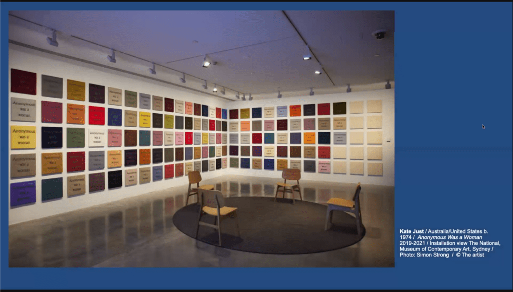 Mayhew had three themes to present in round 2: protest, repair and action. The first artwork she shared, ‘Anonymous Woman’ by Kate Just, is a protest piece, created to celebrate those who have been forgotten. Each square is knitted with the title of the artwork drawing inspiration from Mondrian, craft and the gorilla girls (activists who protested the minimal number of artworks by women in institutions such as the Metropolitan Museum of Art). Over 3500 hours have gone into this artwork and it is dedicated to women throughout history who were marginalized and erased from the history books. It also harks to the way that craft is both feminine and feminist.