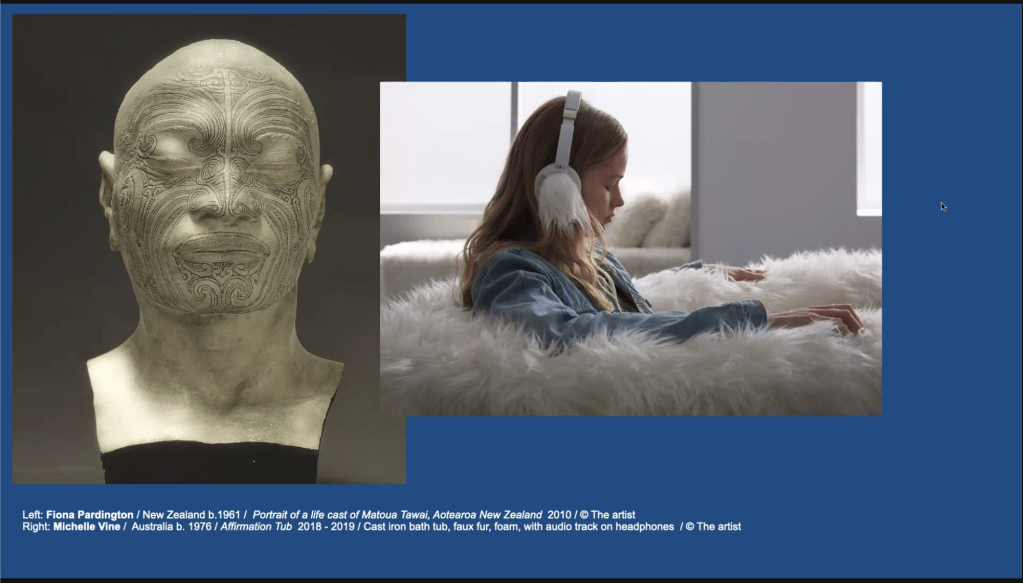 For repair, we have the photographs of Fiona Pardington and the installation of Michelle Vine. Pardington sat with life casts taken of Māori people by colonisers for phrenology purposes. She waited until the light was just right and took a photograph, sitting with these complex histories and taking photographs as a way to try and heal. Vine, on the other hand, created a fluffy bathtub where visitors can pop on some headphones and sit in a comfortable meditative place hearing phrases such as ‘you are beautiful’. What a nice way to spend an afternoon.