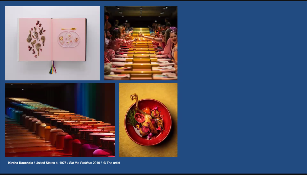 Finally, for action, we had the immersive experience ‘Eat the Problem’ by Kirsha Kaechele. At this dinner party, you are compelled to fix the problem of invasive species by eating them. Gastronomy intersects with eco-activism not only within the walls of the gallery, but at home too. This is achieved through the publication of a cookbook that can influence visitors outside the four gallery walls.