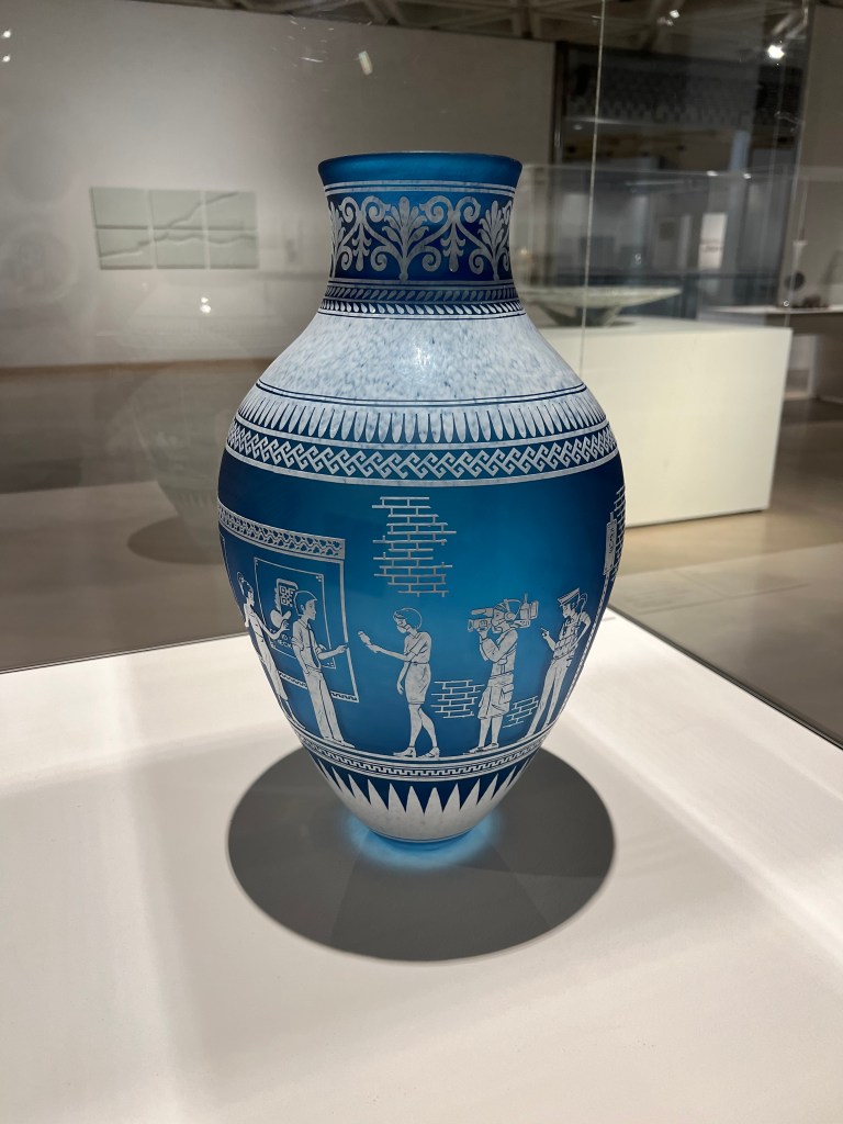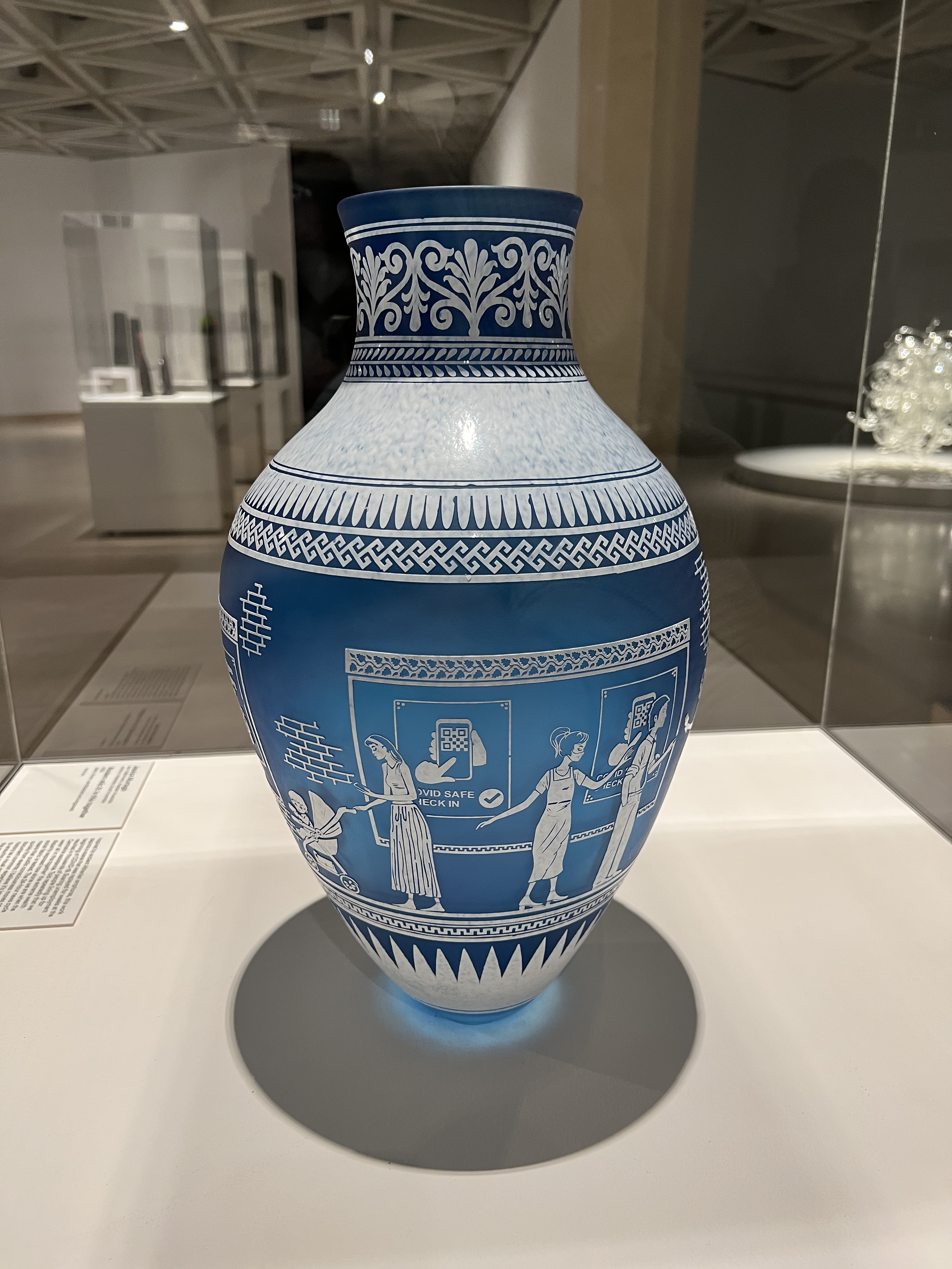 As I was walking around the Gallery I saw an exhibition titled the Tom Malone Prize 2021. Within this exhibition is an artwork that is so close to being one of my favourite artworks I’ve ever seen. The exhibition contains works made from glass. The actual space is very easy to navigate with heaps of room between each artwork. Out of the corner of my eye, I saw this striking blue vase that looked like an ancient Greek vase. When I walked over, the imagery became more and more clear.