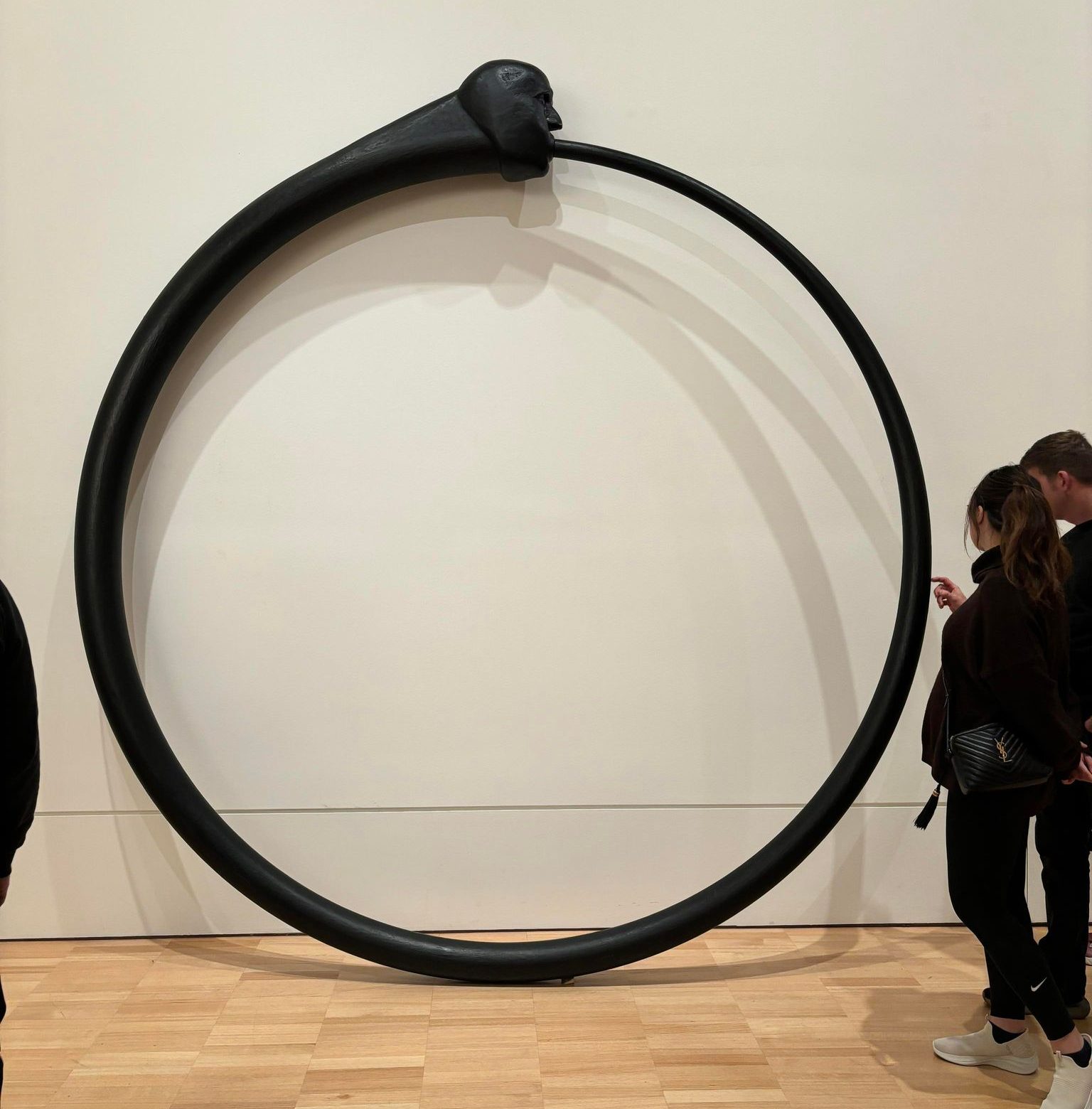 Another fantastic Triennial work that stood out to me while walking around was Ouroboros by Heather B. Swann. It is a striking 3m wide statue carved from wood, leaning against the wall. Ouroboros can be linked to Celtic, Egyptian, Greek, and Viking cultures and is usually depicted as a dragon or snake eating its own tail. In the sculpture, its a human. It’s meant to represent the circle of life and death but, according to the label, add an additional meaning of self-destruction and regeneration.