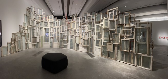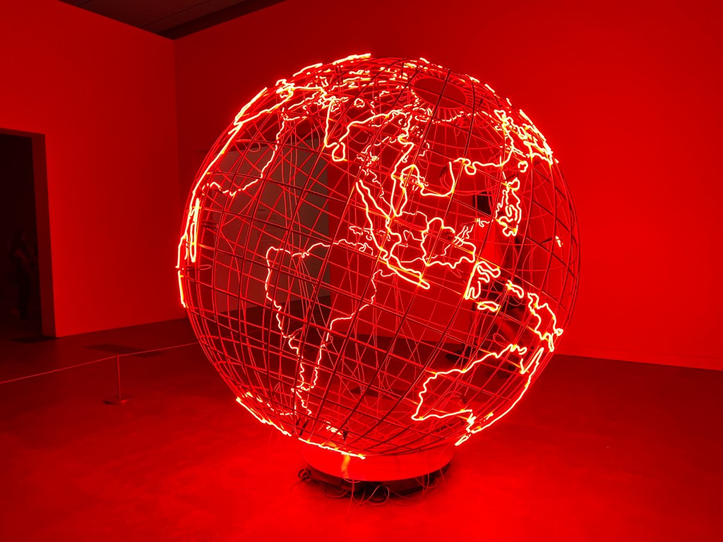 This is definitely an installation that stands out. The combination of stainless steel and neon lights makes a pretty clear statement that the world is one giant hot spot at the hands of climate change and climate inaction. The label, however, highlights that the sculpture also represents how conflict zones and struggles for power are worldwide phenomena with effects felt everywhere. It is meant to be quite a large sculpture so you can imagine yourself trapped inside.